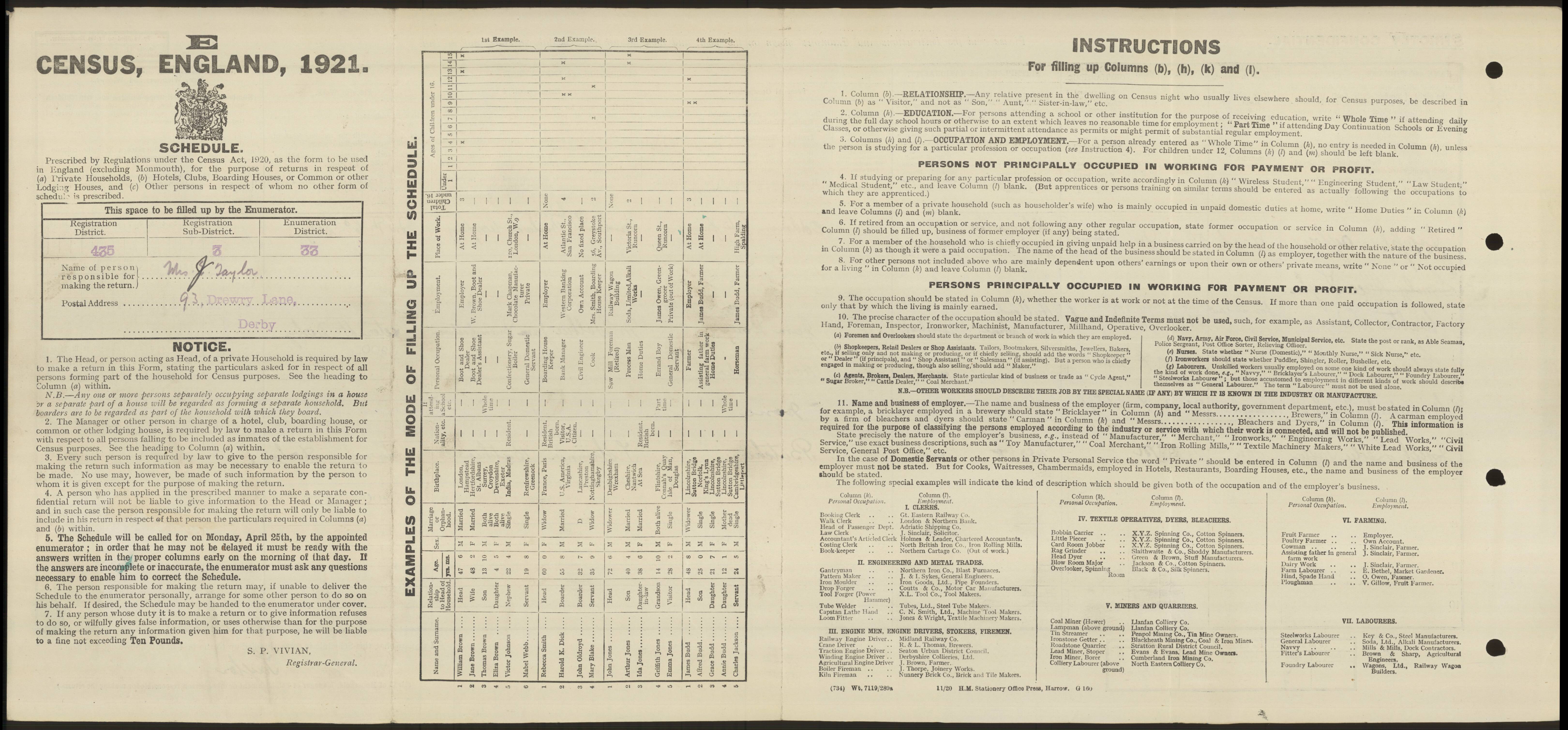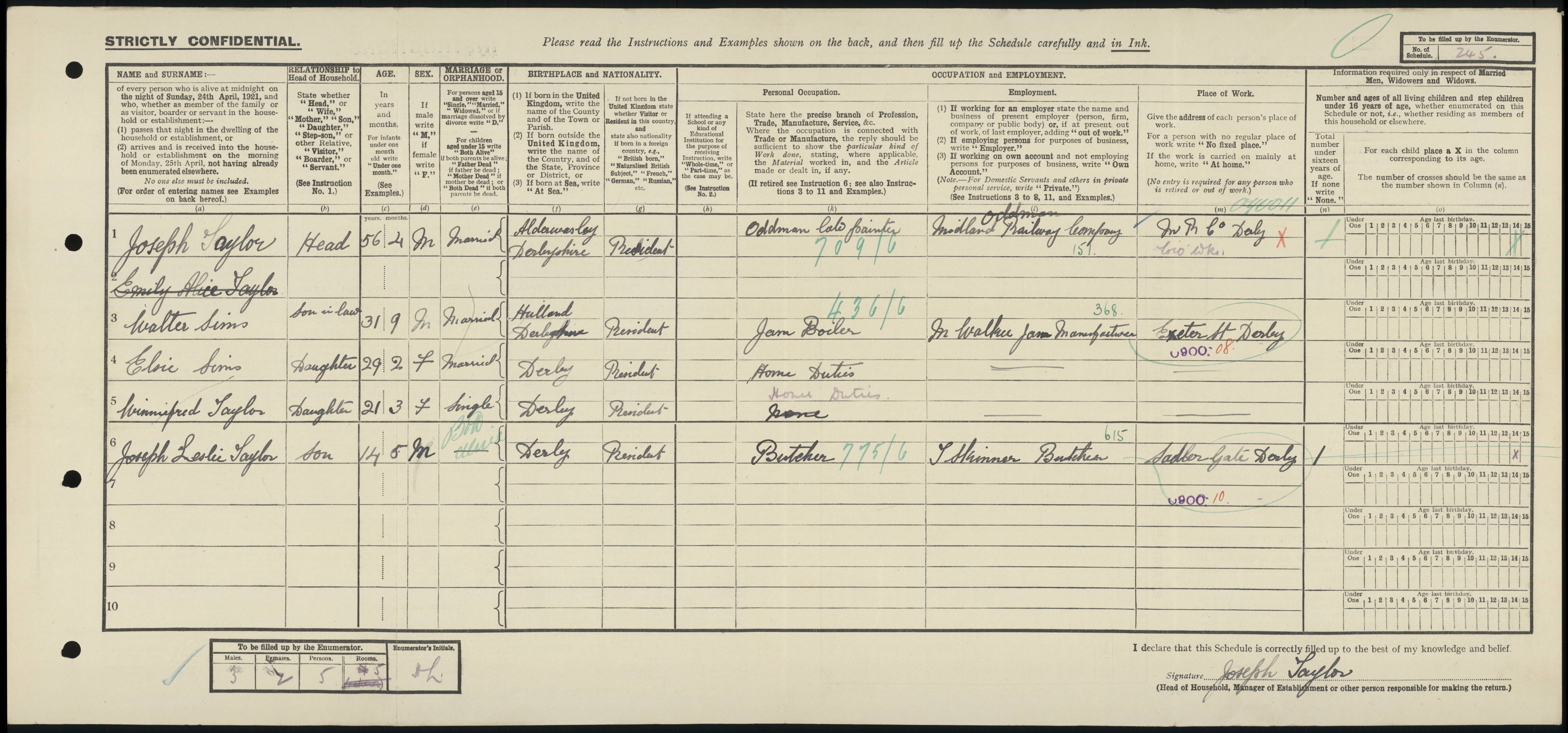 | 1 | 245 | Joseph | Taylor | Head | 1865 | Alderwasley | 56 | Male | Married | | | | Oldman Late Joiner | | | | Midland Railway Company | | 2 | 245 | Emily Alice | Taylor | | | | | | | | | | | | | | | | 3 | 245 | Walter | Sims | Son-in-Law | 1890 | Hulland | 31 | Male | Married | | | | Jam Boiler | | | | M. Walker Jam Manufacturers | | 4 | 245 | Elsie | Sims | Daughter | 1892 | Derby | 29 | Female | Married | | | | Home Duties | | | | | | 5 | 245 | Winifred | Taylor | Daughter | 1900 | Derby | 21 | Female | Single | | | | Home Duties | | | | | | 6 | 245 | Joseph Leslie | Taylor | Son | 1907 | Derby | 14 | Male | Both Alive | | | | Butcher | | | | J. Skinner Butcher |