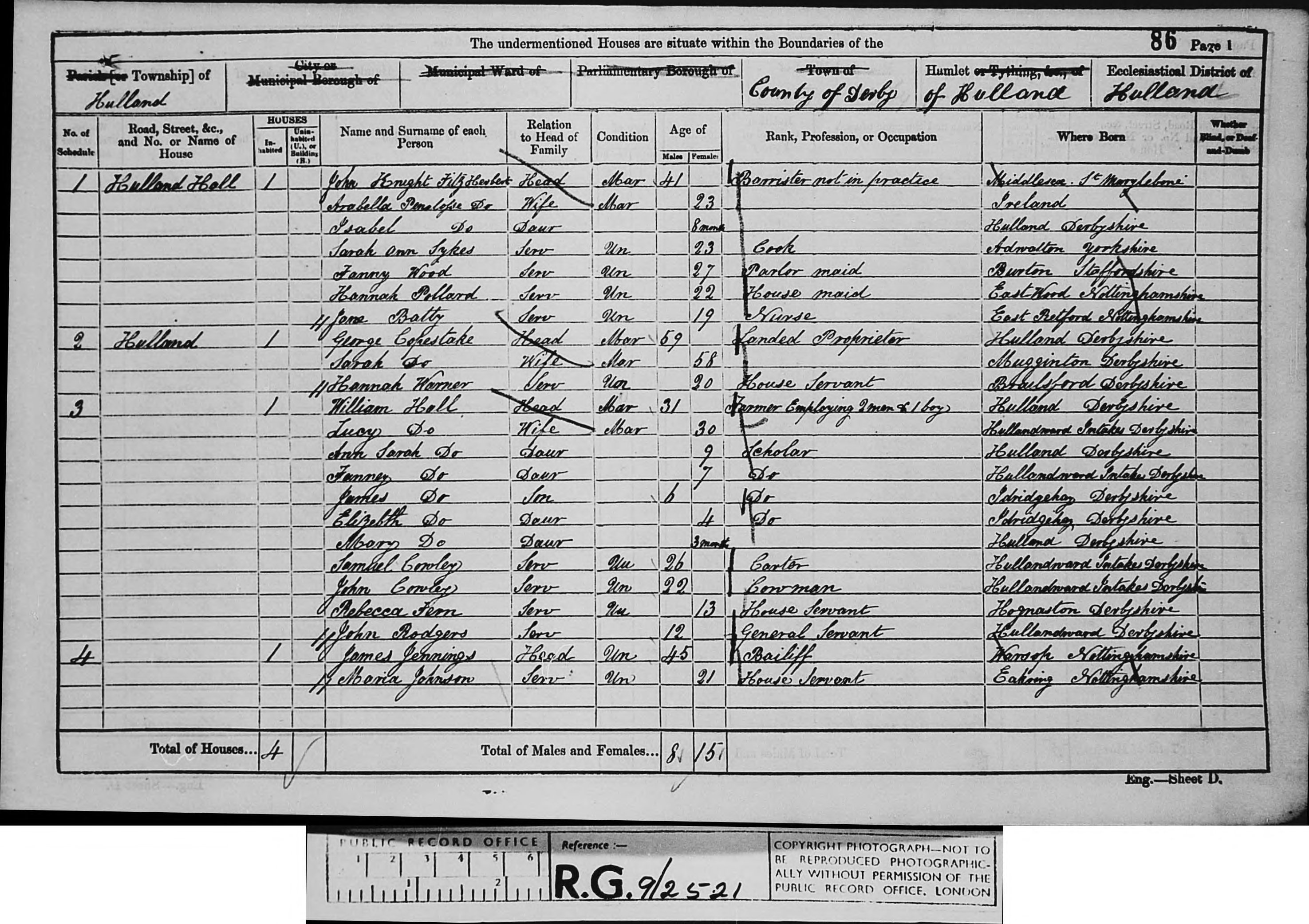 | 11 | 3 | William | Hall | Head | 1830 | Hulland | 31 | Male | Married | | | | Farmer | | | | | | 12 | 3 | Lucy | Hall | Wife | 1831 | Hulland Ward Intakes | 30 | Female | Married | | | | | | | | | | 13 | 3 | Ann Sarah | Hall | Daughter | 1852 | Hulland | 9 | Female | | | | | Scholar | | | | | | 14 | 3 | Fanny | Hall | Daughter | 1854 | Hulland Ward Intakes | 7 | Female | | | | | Scholar | | | | | | 15 | 3 | James | Hall | Son | 1855 | Idridgehay | 6 | Male | | | | | Scholar | | | | | | 16 | 3 | Elizabeth | Hall | Daughter | 1857 | Idridgehay | 4 | Female | | | | | Scholar | | | | | | 17 | 3 | Mary | Hall | Daughter | 1861 | Hulland | 3 Months | Female | | | | | | | | | | | 18 | 3 | Samuel | Corsley | Servant | 1835 | Hulland Ward Intakes | 26 | Male | Single | | | | Carter | | | | | | 19 | 3 | John | Corsley | Servant | 1839 | Hulland Ward Intakes | 22 | Male | Single | | | | Cowman | | | | | | 20 | 3 | Rebecca | Fern | Servant | 1848 | Hognaston | 13 | Female | | | | | House Servant | | | | | | 21 | 3 | John | Rodgers | Servant | 1849 | Hulland Ward IntakesHulland Ward Intakes | 12 | Male | | | | | General Servant | | | | |