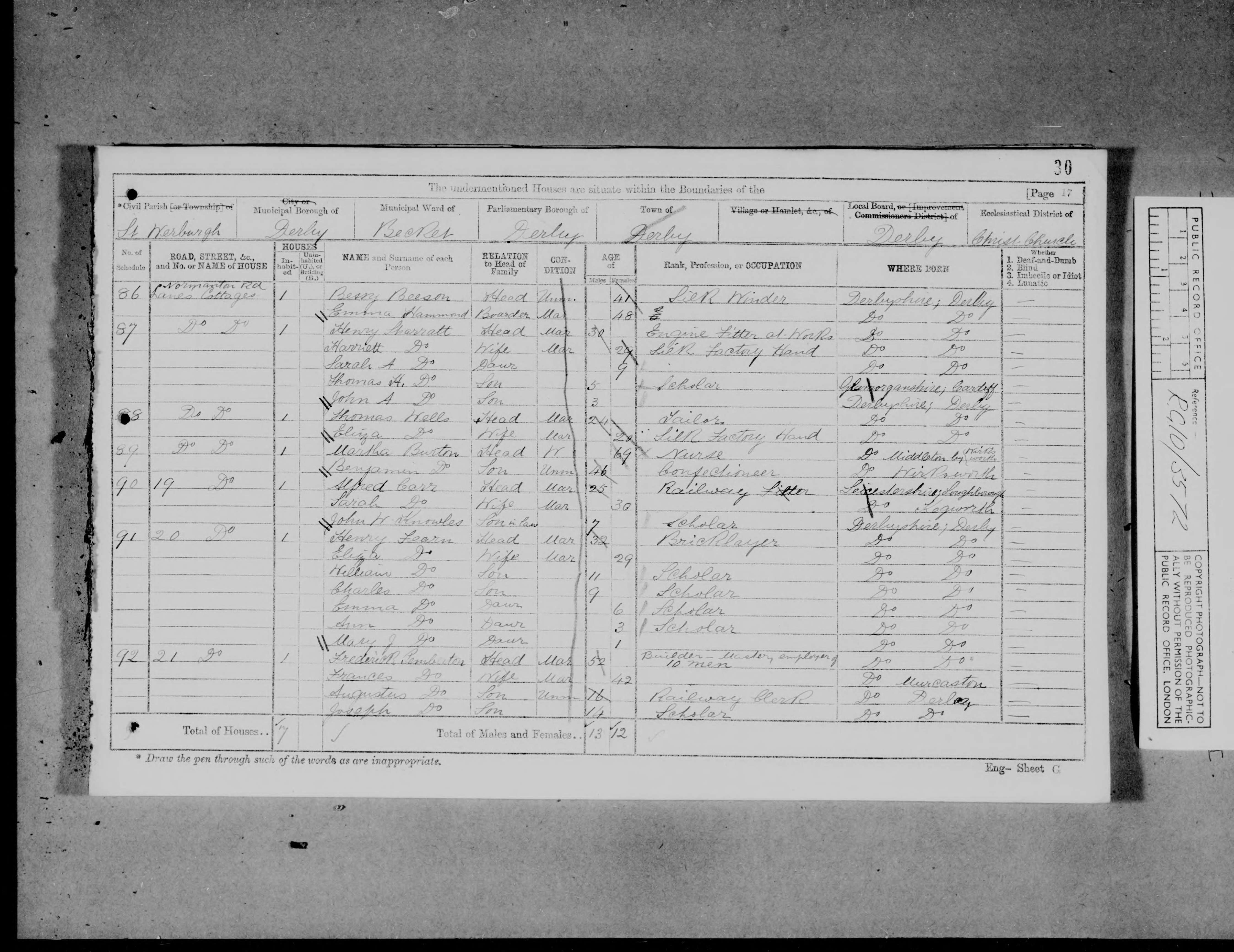 | 1 | 34 | Job | Burton | Head | 1796 | Wirksworth | 55 | Male | Married | | | | Labourer | | | | | | 2 | 34 | Martha | Burton | Wife | 1802 | Middleton | 49 | Female | Married | | | | Labourer's Wife | | | | | | 3 | 34 | Benjamin | Burton | Son | 1824 | Wirksworth | 27 | Male | Single | | | | Baker | | | | | | 4 | 34 | William | Burton | Son | 1834 | Derby | 17 | Male | Single | | | | Solicitor's Copying Clerk | | | | | | 5 | 34 | David | Burton | Son | 1837 | Derby | 14 | Male | Single | | | | Baker's Apprentice | | | | | | 6 | 34 | Sarah | Burton | Daughter | 1841 | Derby | 10 | Female | | | | | School | | | | | | 7 | 34 | Edmund | Burton | Son | 1844 | Derby | 7 | Male | | | | | School | | | | |