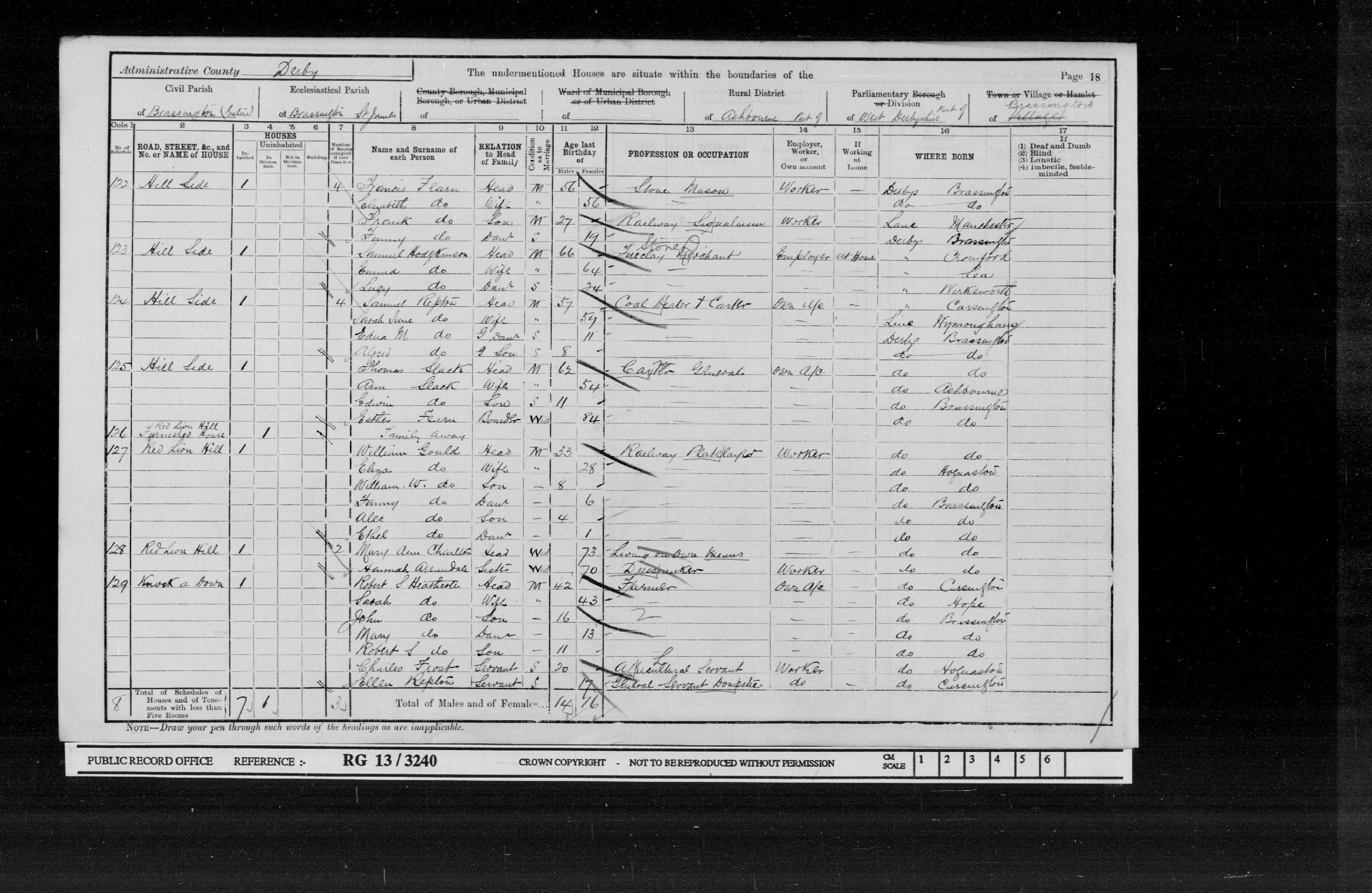 | 10 | 3 | Robert S | Heathcote | Head | 1859 | Carsington | 32 | Male | Widower | | | | Farmer | | | | | | 11 | 3 | John | Heathcote | Son | 1885 | Brassington | 6 | Male | | | | | Scholar | | | | | | 12 | 3 | Joseph | Heathcote | Son | 1886 | Brassington | 5 | Male | | | | | Scholar | | | | | | 13 | 3 | Mary | Heathcote | Daughter | 1888 | Brassington | 3 | Female | | | | | | | | | | | 14 | 3 | Robert S | Heathcote | Son | 1890 | Brassington | 1 | Male | | | | | | | | | | | 15 | 3 | Mary | Buxton | Mother-in-Law | 1828 | Kniveton | 63 | Female | Widow | | | | Living on her own means | | | | | | 16 | 3 | Sarah | Unwin | Servant | 1858 | Hope | 33 | Female | Single | | | | General Domestic Servant | | | | | | 17 | 3 | Frank | Dinoe | Servant | 1874 | Idridgehay | 17 | Male | Single | | | | Farm Servant | | | | |