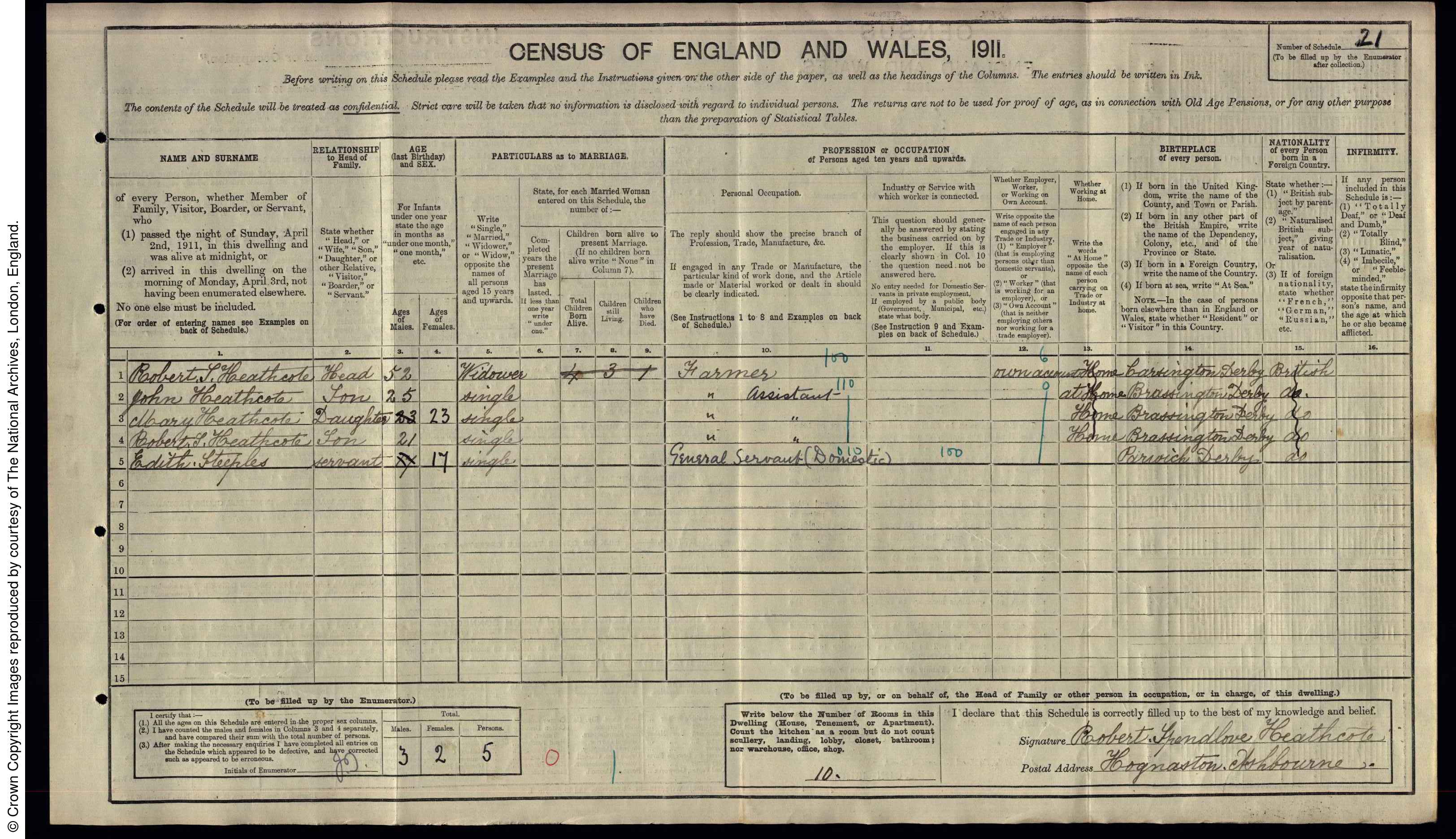 | 1 | 21 | Robert S | Heathcote | Head | 1859 | Carsington | 52 | Male | Widower | | 4 | 3 | Farmer | | | | | | 2 | 21 | John | Heathcote | Son | 1886 | Brassington | 25 | Male | Single | | | | Farmer's Assistant | | | | | | 3 | 21 | Mary | Heathcote | Daughter | 1888 | Brassington | 23 | Female | Single | | | | Farmer's Assistant | | | | | | 4 | 21 | Robert S | Heathcote | Son | 1890 | Brassington | 21 | Male | Single | | | | Farmer's Assistant | | | | | | 5 | 21 | Edith | Steeples | Servant | 1894 | Parwich | 17 | Female | Single | | | | General Servant Domestic | | | | |