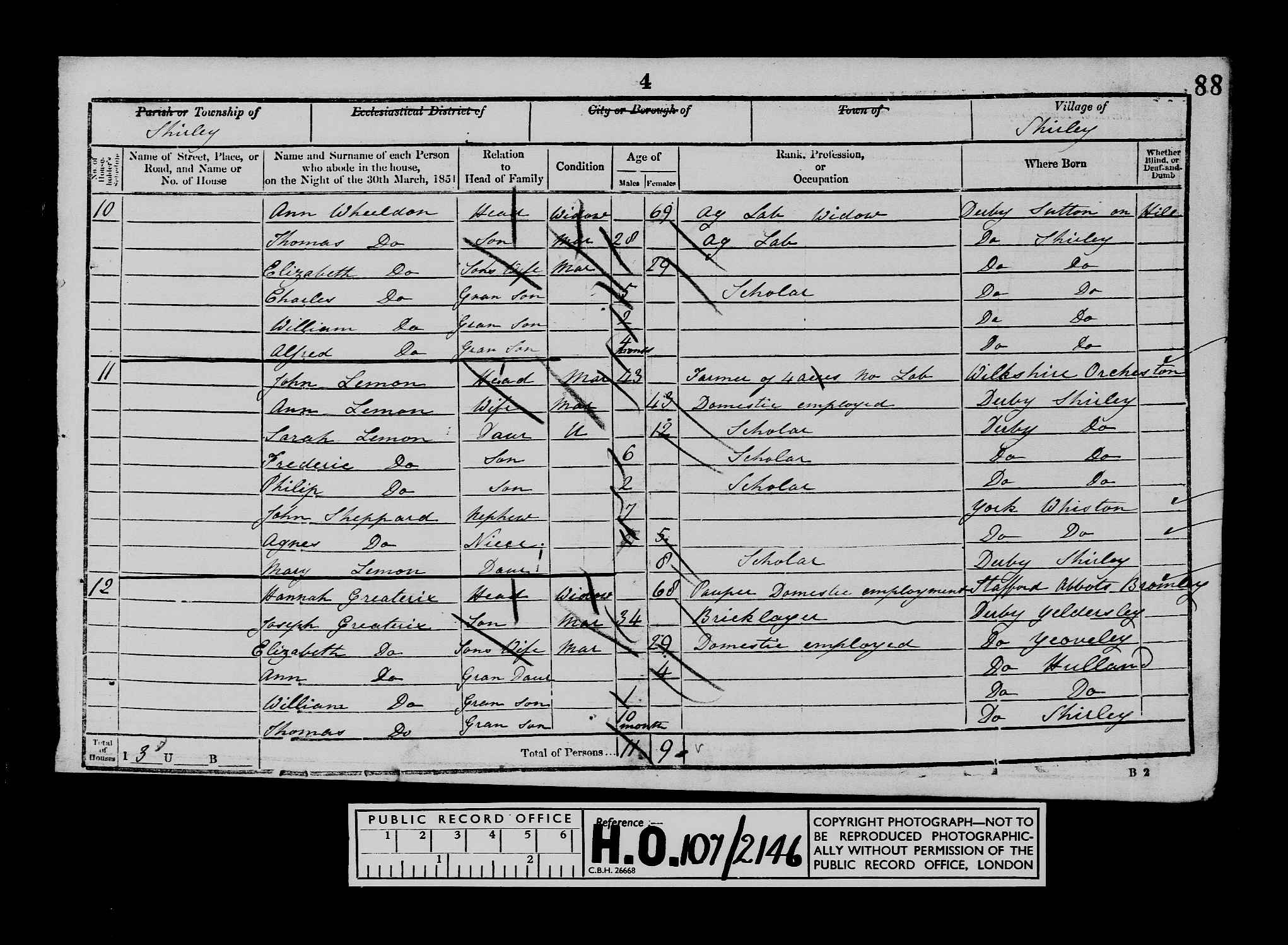 | 7 | 11 | John | Lemon | Head | 1808 | Orcheston | 43 | Male | Married | | | | | | | | | | 8 | 11 | Ann | Lemon | Wife | 1808 | Shirley | 43 | Female | Married | | | | Farmer | | | | | | 9 | 11 | Sarah | Lemon | Daughter | 1839 | Shirley | 12 | Female | Single | | | | Domestic Employed | | | | | | 10 | 11 | Frederic | Lemon | Son | 1845 | Shirley | 6 | Male | | | | | Scholar | | | | | | 11 | 11 | Philip | Lemon | Son | 1849 | Shirley | 2 | Male | | | | | Scholar | | | | | | 12 | 11 | John | Sheppard | Nephew | 1844 | Whiston | 7 | Male | | | | | Scholar | | | | | | 13 | 11 | Agnes | Sheppard | Niece | 1846 | Whiston | 5 | Female | | | | | | | | | | | 14 | 11 | Mary | Lemon | Daughter | 1843 | Shirley | 8 | Female | | | | | Scholar | | | | |