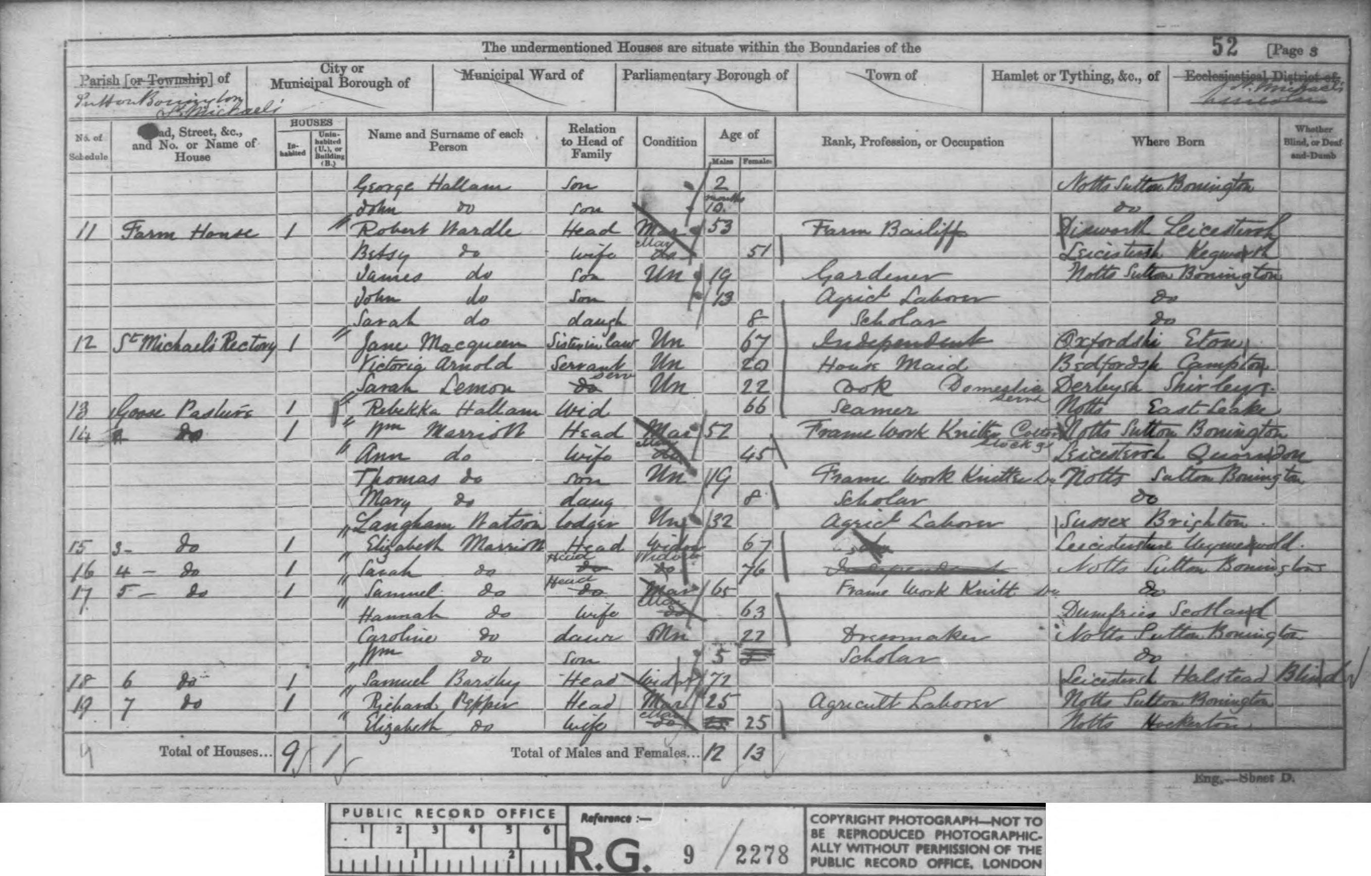 | 8 | 12 | Jane | MacQueen | Sister-in-Law | 1794 | Oxfordshire | 67 | Female | Single | | | | Independent | | | | | | 9 | 12 | Victoria | Arnold | Servant | 1841 | Campton | 20 | Female | Single | | | | House Maid | | | | | | 10 | 12 | Sarah | Lemon | Servant | 1839 | Shirley | 22 | Female | Single | | | | Domestic Servant | | | | |