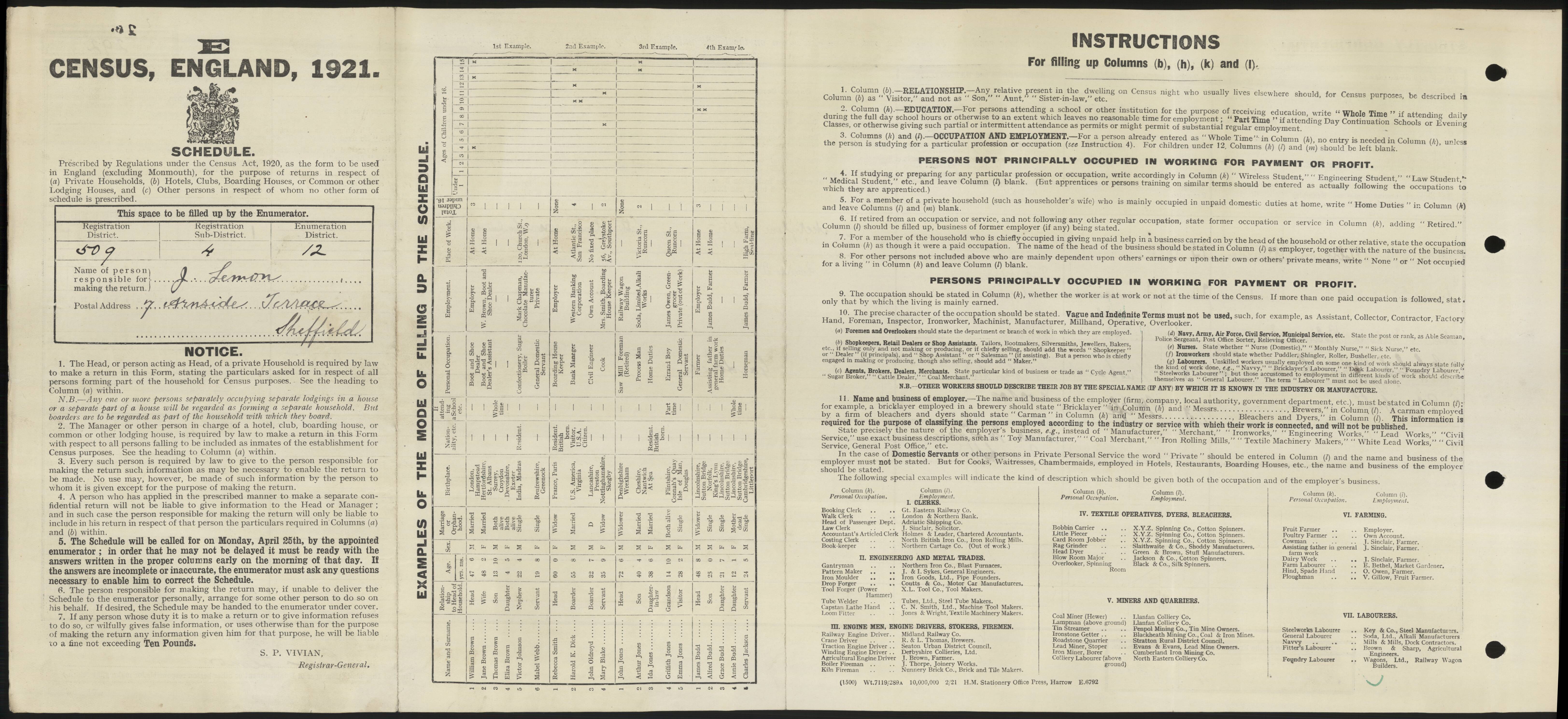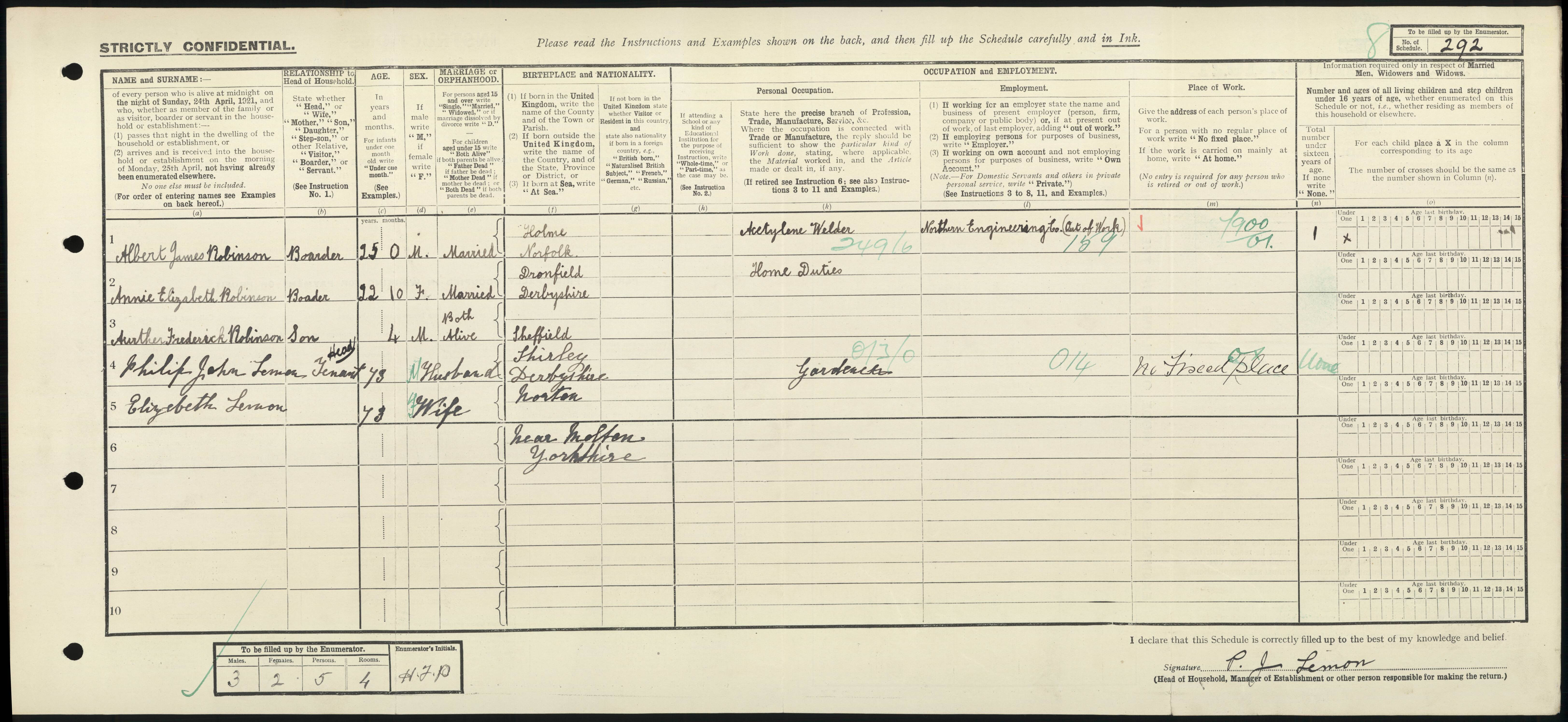 | 1 | 292 | Albert James | Robinson | Boarder | 1896 | Norfolk | 25 | Male | Married | | | | Acetylene Welder | | | | Northern Engineering Co. | | 2 | 292 | Annie Elizabeth | Robinson | Boarder | 1899 | Dronfield | 22 | Female | Married | | | | Home Duties | | | | | | 3 | 292 | Arthur Frederick | Robinson | Son | 1921 | Sheffield | 4 Months | Male | Both Alive | | | | | | | | | | 4 | 292 | Philip John | Lemon | Head | 1848 | Shirley | 73 | Male | Married | | | | Gardener | | | | | | 5 | 292 | Elizabeth | Lemon | Wife | 1848 | Norton | 73 | Female | Married | | | | | | | | |