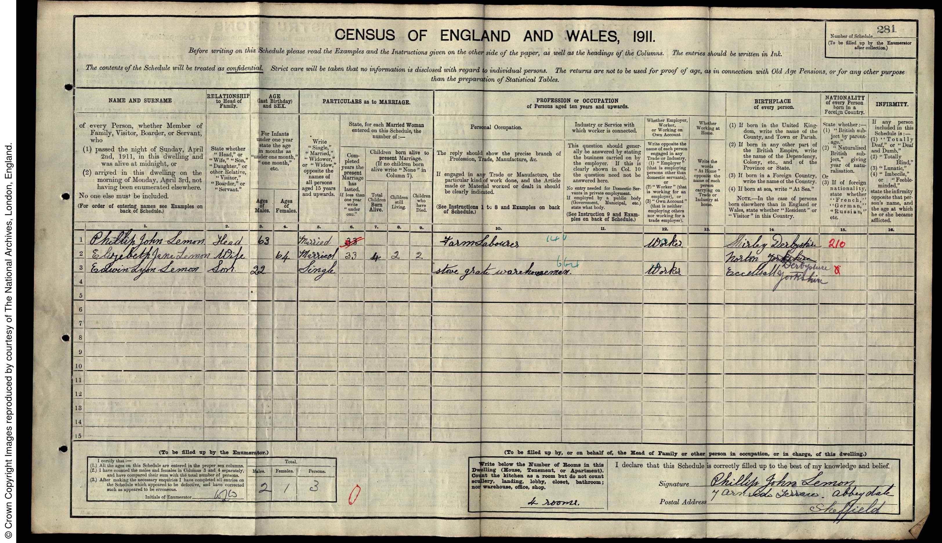 | 1 | 281 | Philip John | Lemon | Head | 1848 | Shirley | 63 | Male | Married | | | | Farm Labourer | | | | | | 2 | 281 | Elizabeth Jane | Lemon | Wife | 1847 | Norton | 64 | Female | Married | 33 | 4 | 2 | | | | | | | 3 | 281 | Edwin Lyon | Lemon | Son | 1889 | Ecclesall | 22 | Male | Single | | | | Stove Grate Warehouseman | | | | |