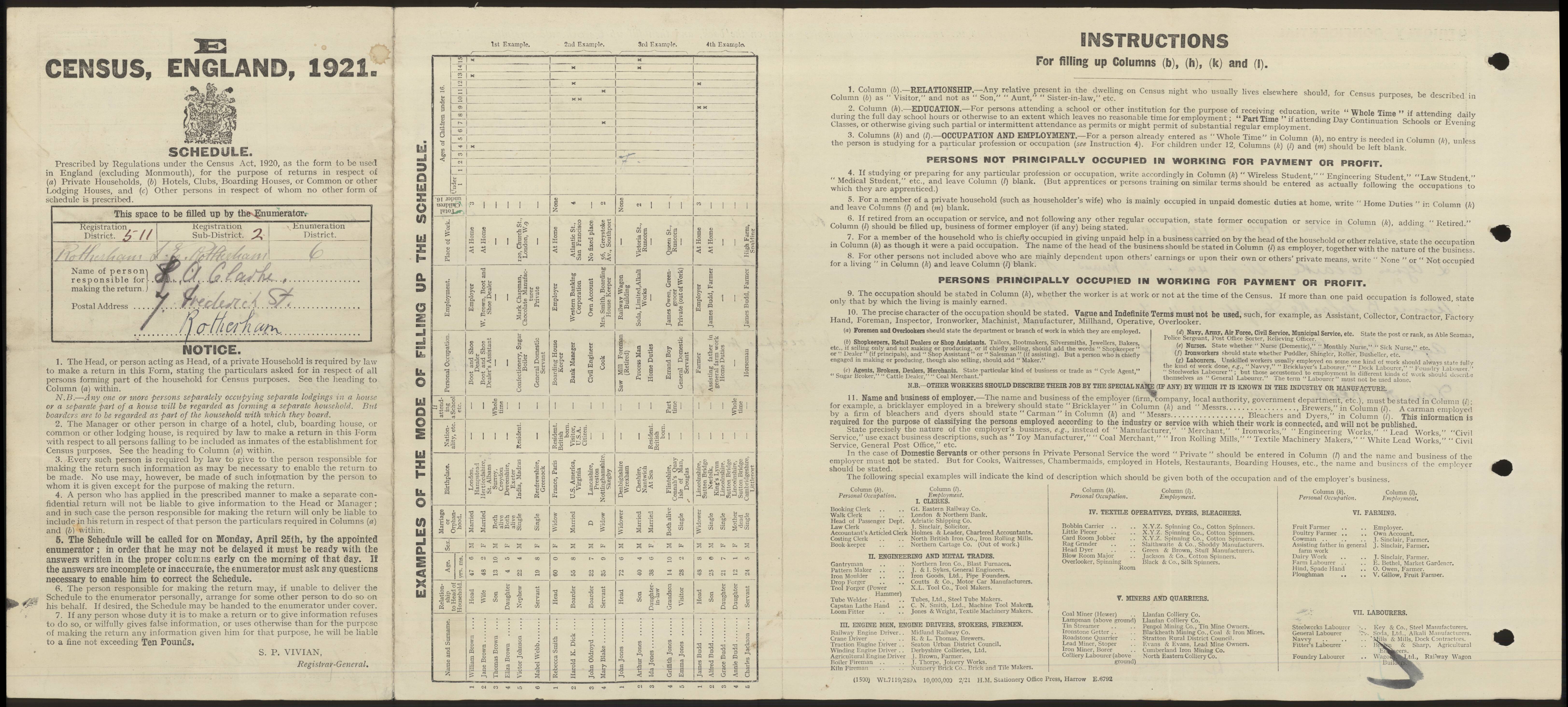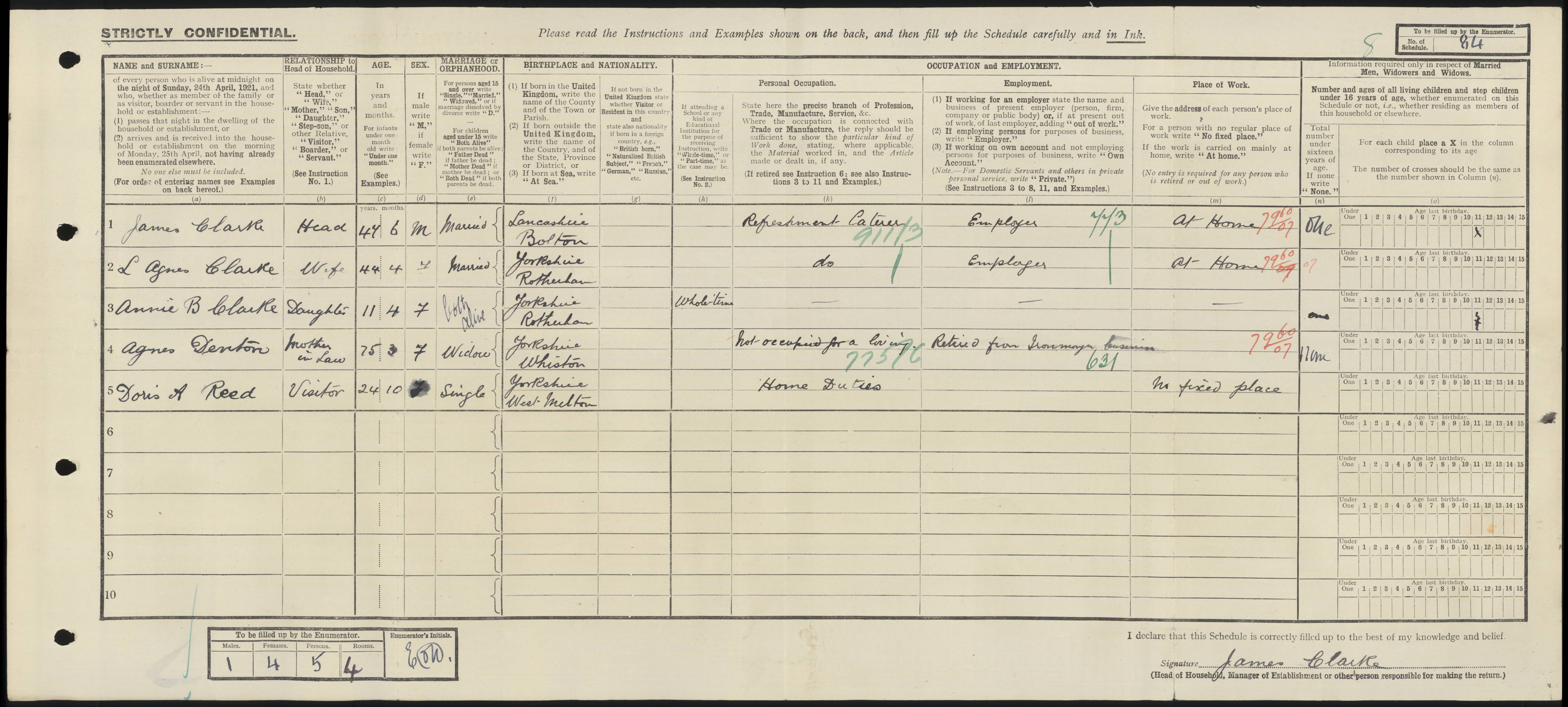| 1 | 84 | James | Clarke | Head | 1874 | Lancashire | 47 | Male | Married | | | | Refreshment Caterer | | | | | | 2 | 84 | L Agnes | Clarke | Wife | 1877 | Rotherham | 44 | Female | Married | | | | Refreshment Caterer | | | | | | 3 | 84 | Annie B | Clarke | Daughter | 1910 | Rotherham | 11 | Female | Both Alive | | | | | | | | | | 4 | 84 | Agnes | Denton | Mother-in-Law | 1846 | Whiston | 75 | Female | Widow | | | | Not Occupied for a living | | | | | | 5 | 84 | Doris A | Reed | Visitor | 1897 | Yorkshire | 24 | Female | Single | | | | Home Duties | | | | |