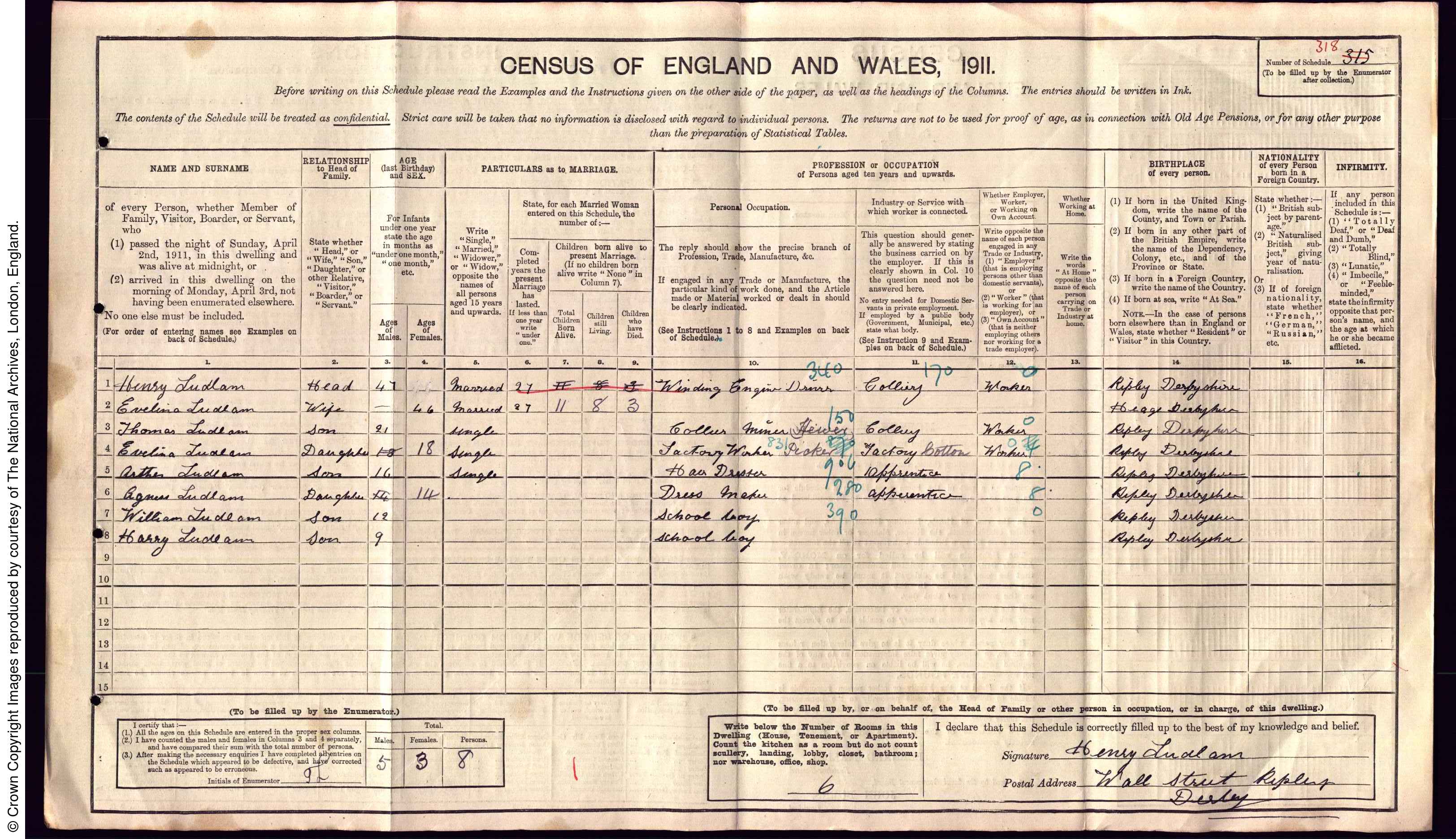 | 1 | 318 | Henry | Ludlam | Head | 1864 | Ripley | 47 | Male | Married | | | | Winding Engine Driver | | | | | | 2 | 318 | Evelina | Ludlam | Wife | 1865 | Heage | 46 | Female | Married | 27 | 11 | 8 | | | | | | | 3 | 318 | Thomas | Ludlam | Son | 1890 | Ripley | 21 | Male | Single | | | | Collier Miner Hewer | | | | | | 4 | 318 | Evelina | Ludlam | Daughter | 1893 | Ripley | 18 | Female | Single | | | | Factory Worker Picker | | | | | | 5 | 318 | Arthur | Ludlam | Son | 1895 | Ripley | 16 | Male | Single | | | | Hair Dresser | | | | | | 6 | 318 | Agnes | Ludlam | Daughter | 1897 | Ripley | 14 | Female | | | | | Dressmaker | | | | | | 7 | 318 | William | Ludlam | Son | 1899 | Ripley | 12 | Male | | | | | School Boy | | | | | | 8 | 318 | Harry | Ludlam | Son | 1902 | Ripley | 9 | Male | | | | | School Boy | | | | |