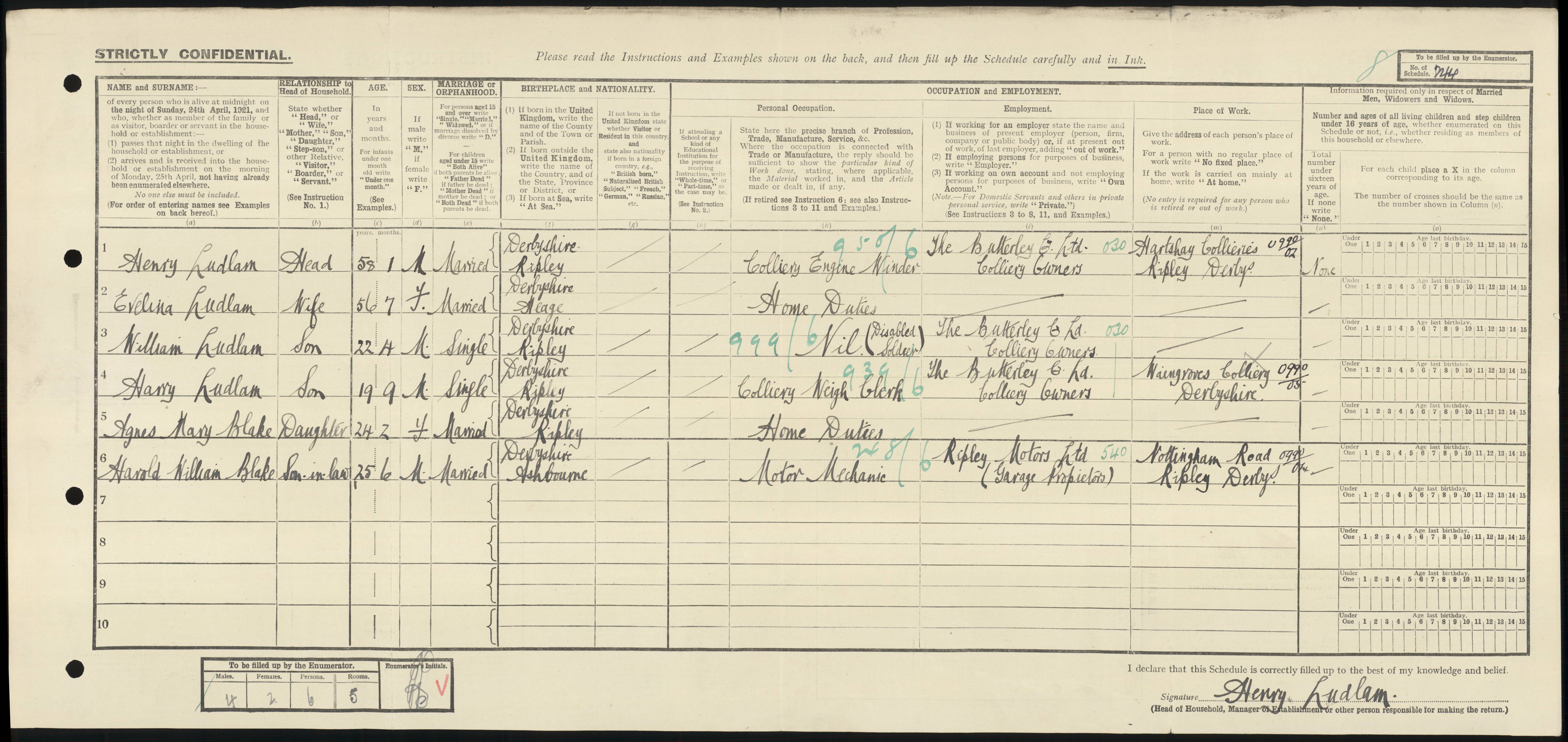 | 1 | 244 | Henry | Ludlam | Head | 1863 | Ripley | 58 | Male | Married | | | | Colliery Engine Winder | | | | Hartshay Colliery | | 2 | 244 | Evelina | Ludlam | Wife | 1865 | Heage | 56 | Female | Married | | | | Home Duties | | | | | | 3 | 244 | William | Ludlam | Son | 1899 | Ripley | 22 | Male | Single | | | | Disabled Soldier | | | | | | 4 | 244 | Harry | Ludlam | Son | 1902 | Ripley | 19 | Male | Single | | | | Colliery Weigh Clerk | | | | Waingroves Colliery | | 5 | 244 | Agnes Mary | Blake | Daughter | 1897 | Ripley | 24 | Female | Married | | | | Home Duties | | | | | | 6 | 244 | Harold William | Blake | Son-in-Law | 1896 | Ashbourne | 25 | Male | Married | | | | Motor Mechanic | | | | Ripley Motors |