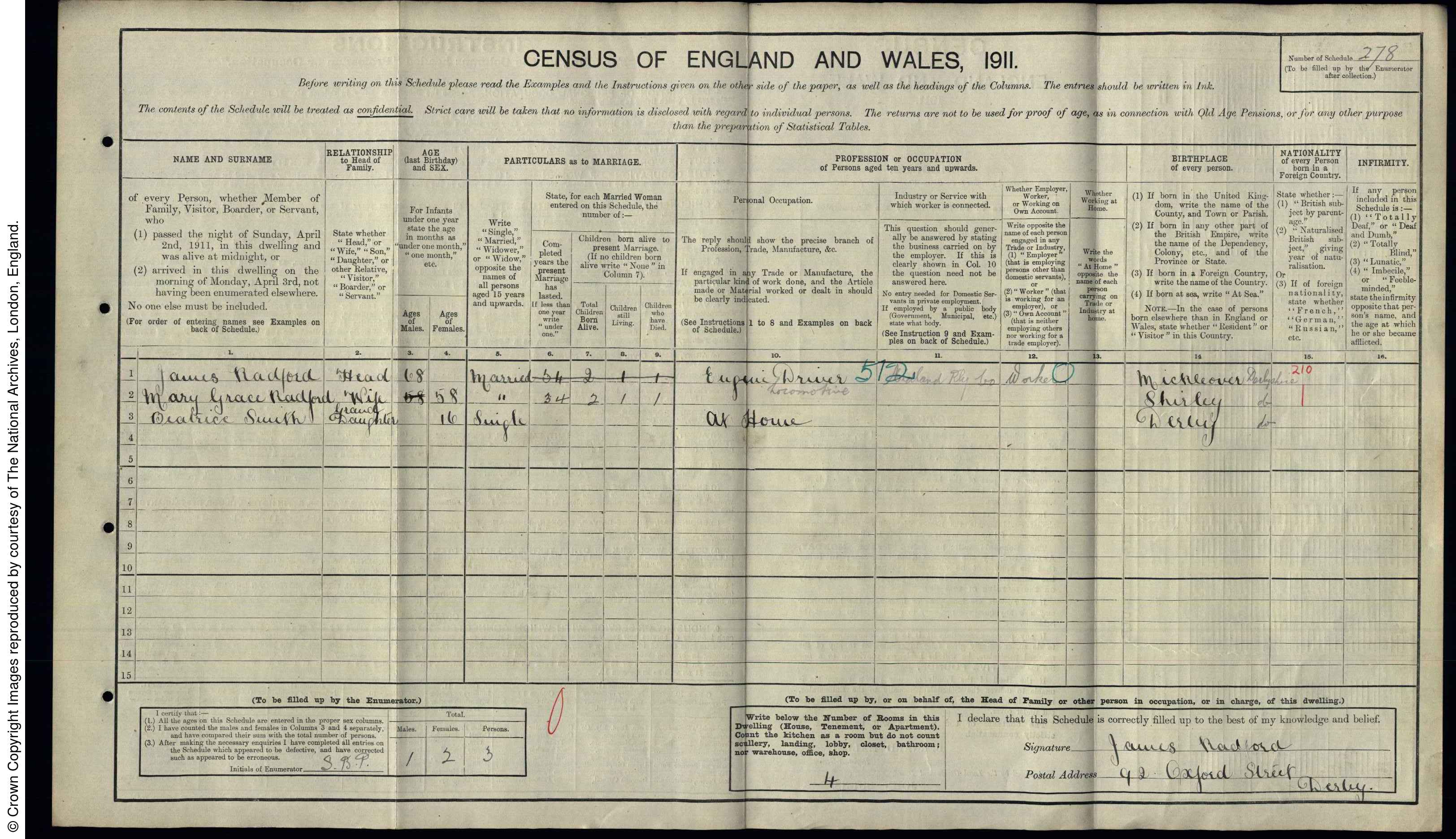 | 1 | 278 | James | Radford | Head | 1843 | Mickleover | 68 | Male | Married | | | | Engine Driver Locomotive | | | | | | 2 | 278 | Mary Grace | Radford | Wife | 1853 | Shirley | 58 | Female | Married | 34 | 2 | 1 | | | | | | | 3 | 278 | Beatrice | Smith | Granddaughter | 1895 | Derby | 16 | Female | Single | | | | At Home | | | | |