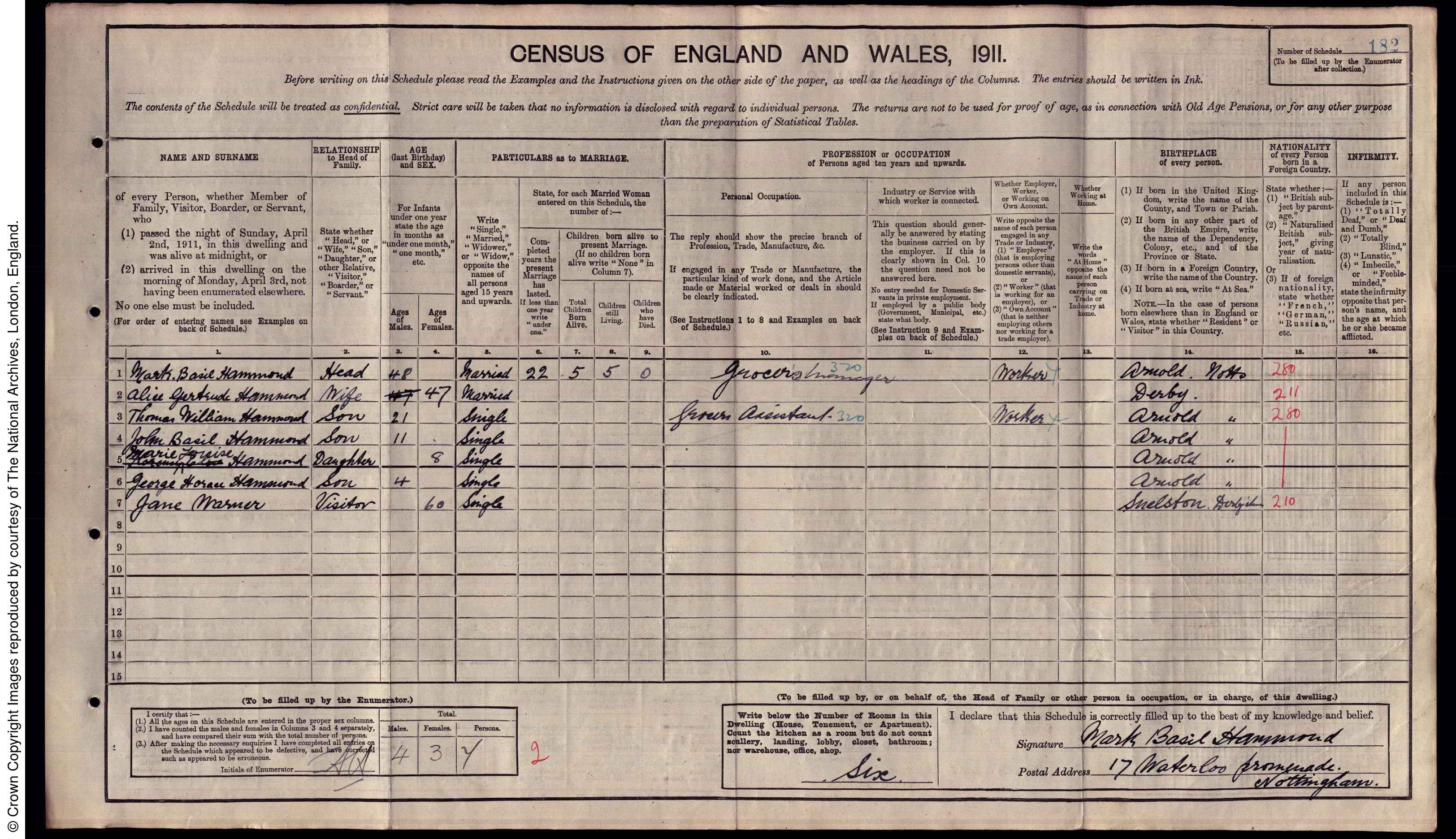 | 1 | 182 | Mark Basil | Hammond | Head | 1863 | Arnold | 48 | Male | Married | | | | Grocer's Manager | | | | | | 2 | 182 | Alice Gertrude | Hammond | Wife | 1864 | Derby | 47 | Female | Married | 22 | 5 | 5 | | | | | | | 3 | 182 | Thomas William | Hammond | Son | 1890 | Arnold | 21 | Male | Single | | | | Grocer's Assistant | | | | | | 4 | 182 | John Basil | Hammond | Son | 1900 | Arnold | 11 | Male | Single | | | | | | | | | | 5 | 182 | Marie Louise | Hammond | Daughter | 1903 | Arnold | 8 | Female | Single | | | | | | | | | | 6 | 182 | George Horace | Hammond | Son | 1907 | Arnold | 4 | Male | Single | | | | | | | | | | 7 | 182 | Jane | Warner | Visitor | 1851 | Snelston | 60 | Female | Single | | | | | | | | |