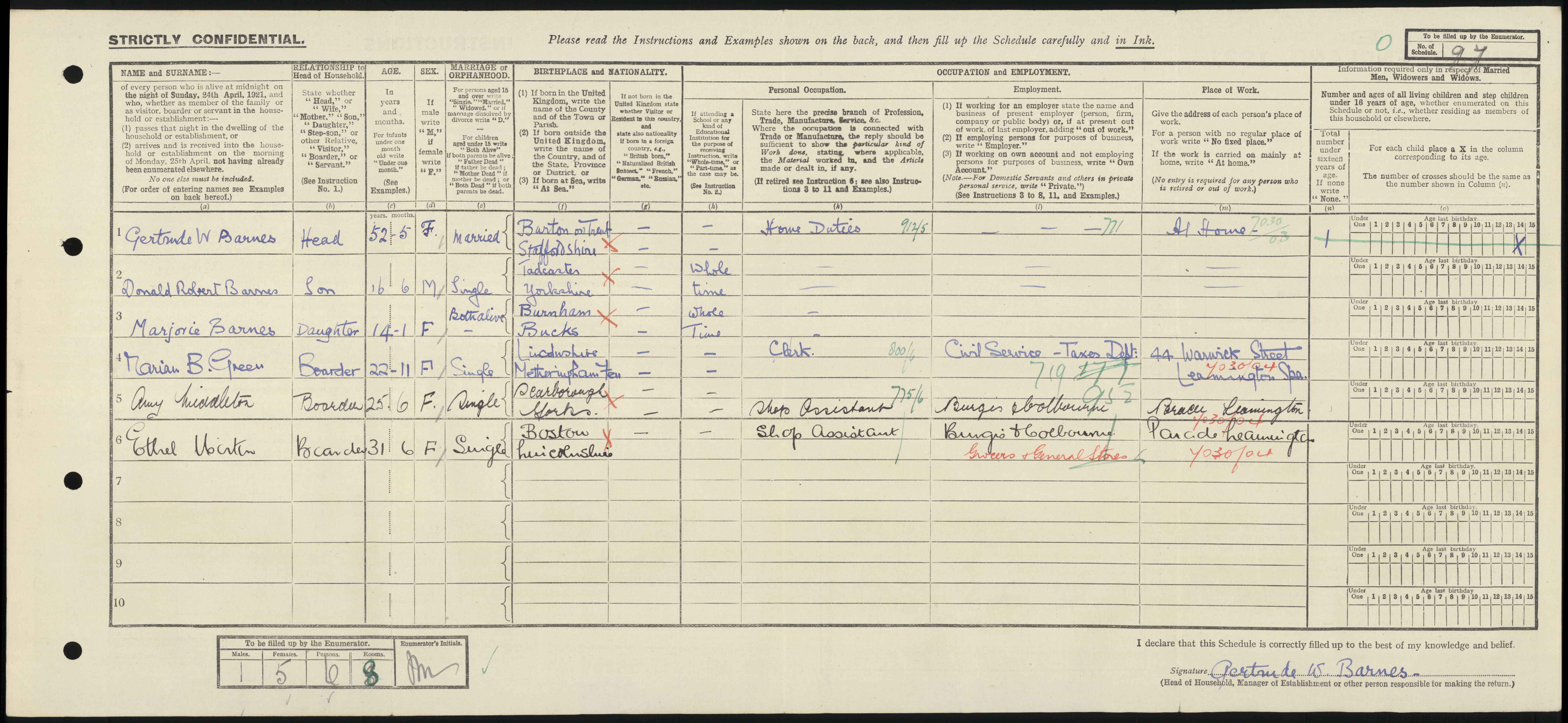 | 1 | 97 | Gertrude W | Barnes | Head | 1869 | Burton on Trent | 52 | Female | Married | | | | Home Duties | | | | | | 2 | 97 | Donald Robert | Barnes | Son | 1905 | Tadcaster | 16 | Male | Single | | | | | | | | | | 3 | 97 | Marjorie | Barnes | Daughter | 1907 | Burnham | 14 | Female | Both Alive | | | | | | | | | | 4 | 97 | Marian B | Green | Boarder | 1899 | Lincolnshire | 22 | Female | Single | | | | Clerk | | | | Civil Service Taxes Dept. | | 5 | 97 | Amy | Middleton | Boarder | 1896 | Scarborough | 25 | Female | Single | | | | Shop Assistant | | | | Burgis & Colbourne | | 6 | 97 | Ethel | Martin | Boarder | 1890 | Boston | 31 | Female | Single | | | | Shop Assistant | | | | Burgis & Colbourne |