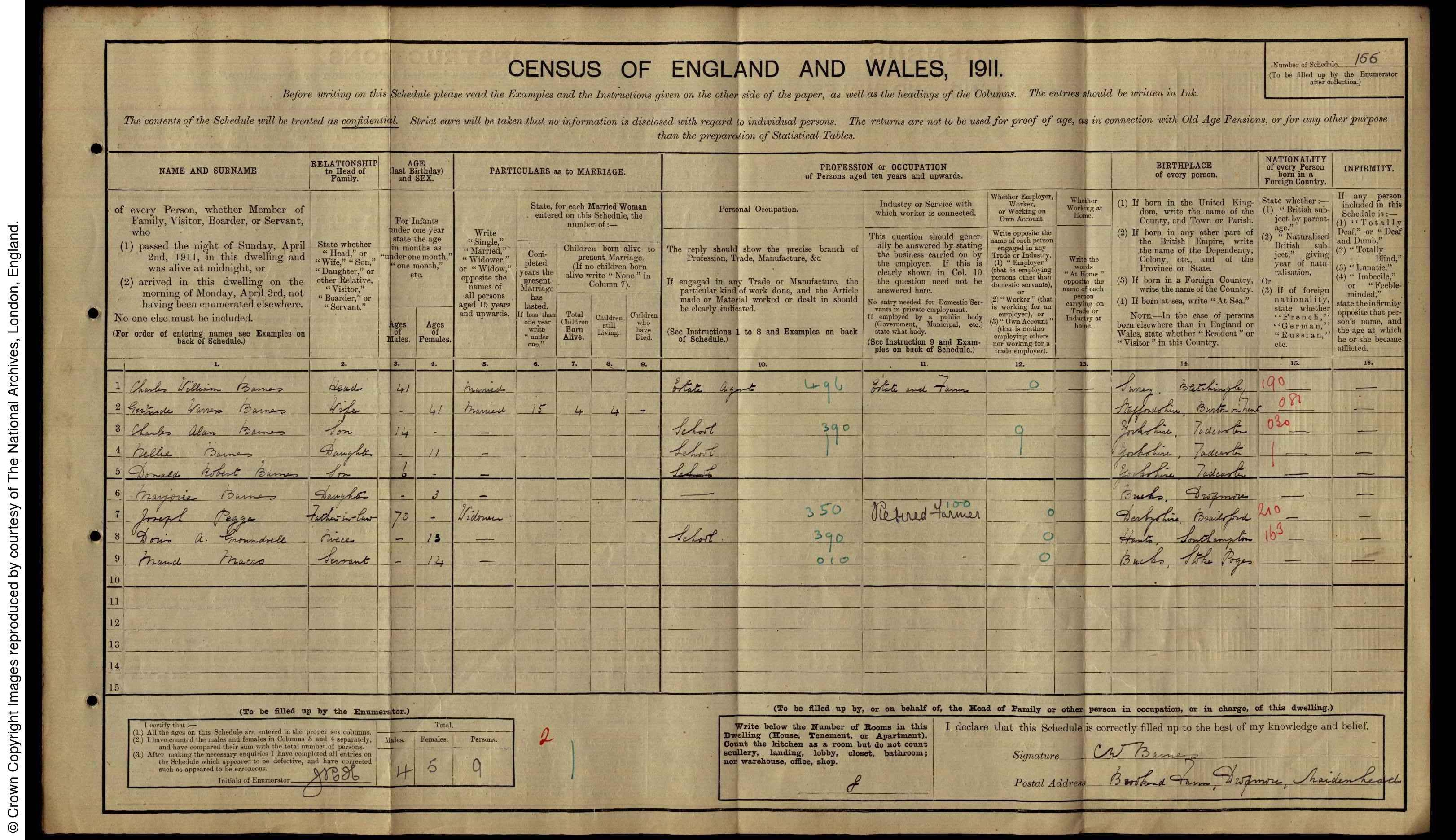 | 1 | 155 | Charles William | Barnes | Head | 1870 | Bletchingley | 41 | Male | Married | | | | Estate and Farm | | | | | | 2 | 155 | Gertrude Warren | Barnes | Wife | 1870 | Burton on Trent | 41 | Female | Married | 15 | 4 | 4 | | | | | | | 3 | 155 | Charles Alan | Barnes | Son | 1897 | Tadcaster | 14 | Male | | | | | School | | | | | | 4 | 155 | Nellie | Barnes | Daughter | 1900 | Tadcaster | 11 | Female | | | | | School | | | | | | 5 | 155 | Donald Robert | Barnes | Son | 1905 | Tadcaster | 6 | Male | | | | | | | | | | | 6 | 155 | Marjorie | Barnes | Daughter | 1908 | Dropmore | 3 | Female | | | | | | | | | | | 7 | 155 | Joseph | Pegge | Father-in-Law | 1841 | Brailsford | 70 | Male | Widower | | | | Retired farmer | | | | | | 8 | 155 | Doris A | Groundsell | Niece | 1898 | Southampton | 13 | Female | | | | | School | | | | | | 9 | 155 | Maud | Macro | Servant | 1897 | Stoke Poges | 14 | Female | | | | | | | | | |