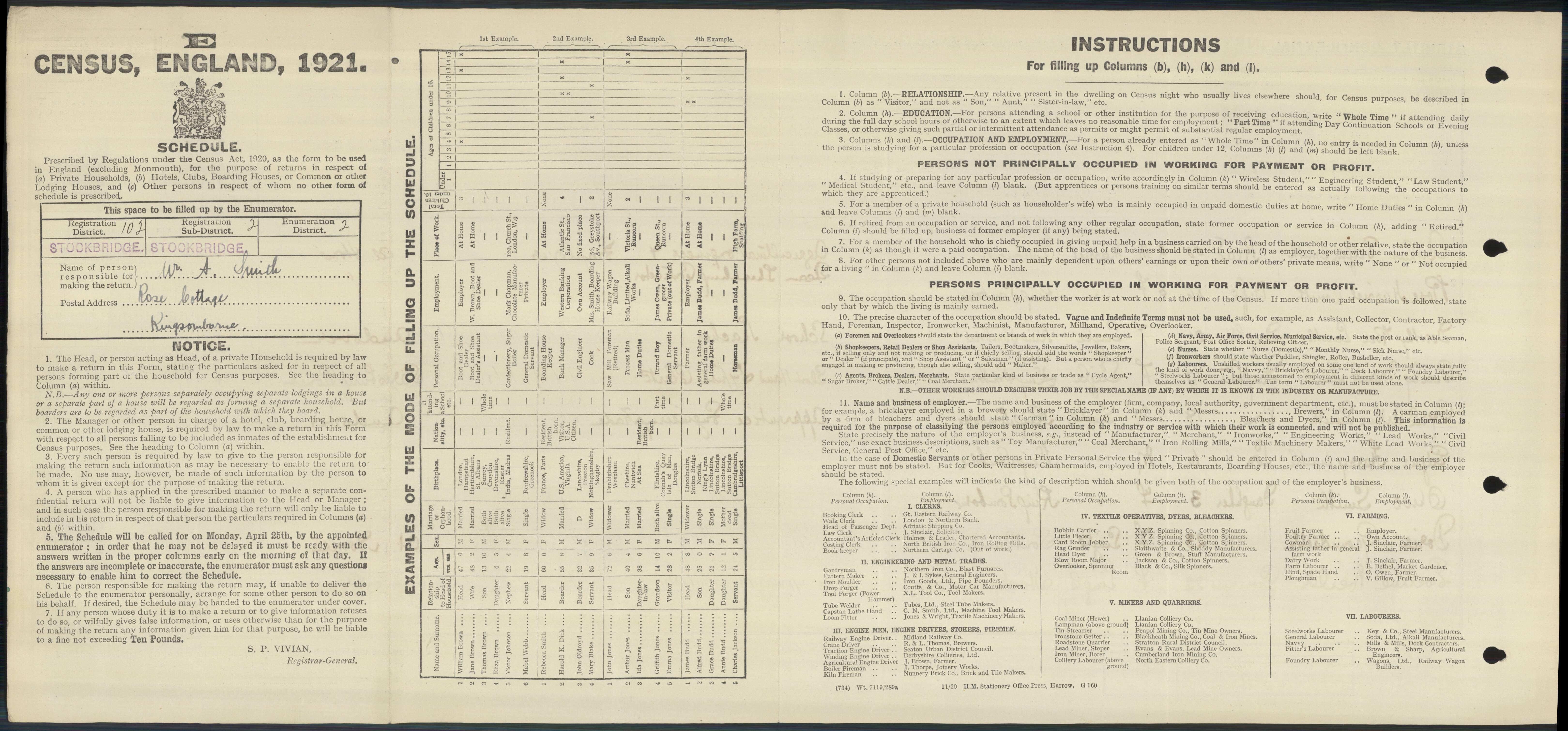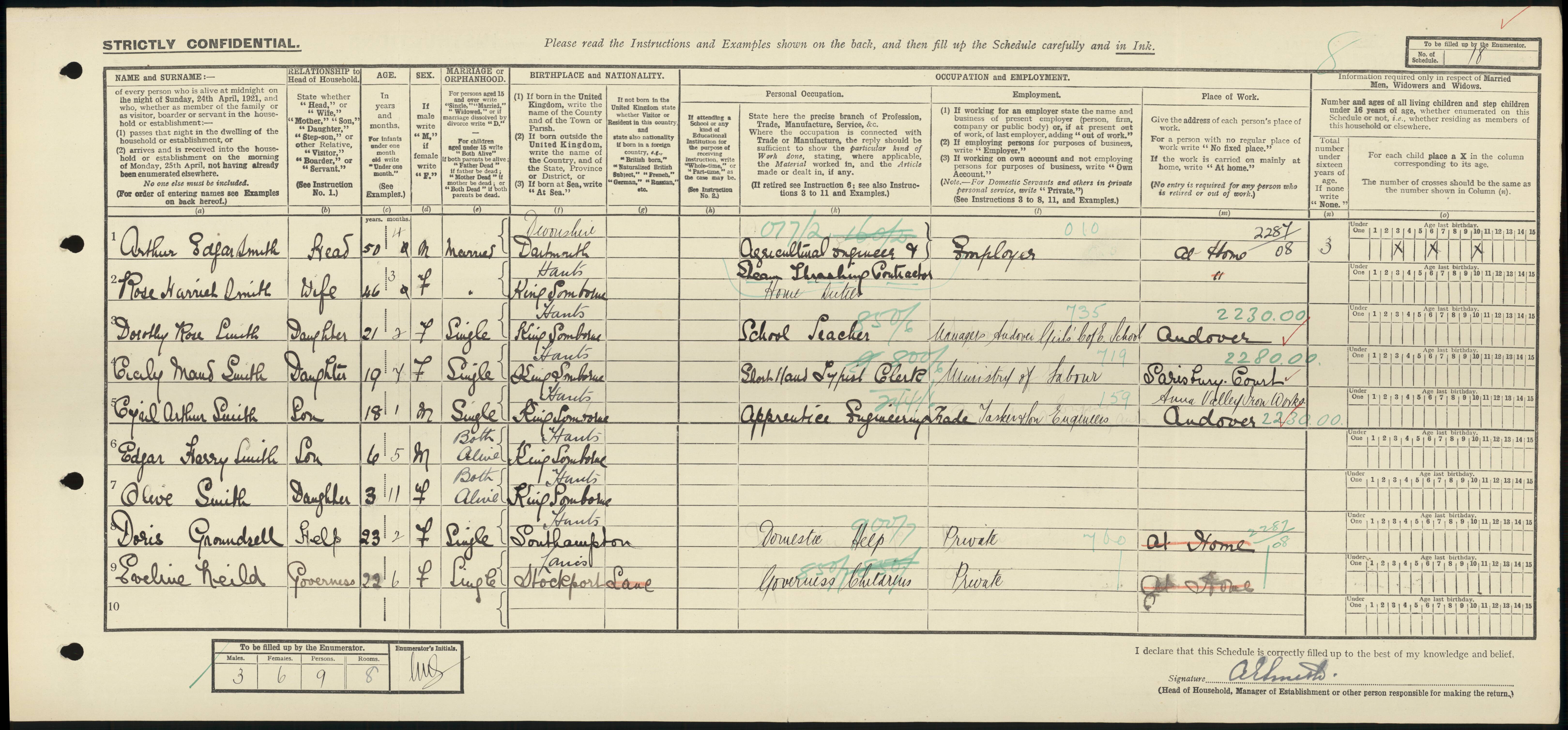 | 1 | 18 | Arthur Edgar | Smith | Head | 1871 | Dartmouth | 50 | Male | Married | | | | Agricultural Engineer & Steamship Co | | | | | | 2 | 18 | Rose Harriet | Smith | Wife | 1875 | King's Somborne | 46 | Female | Married | | | | Home Duties | | | | | | 3 | 18 | Dorothy Rose | Smith | Daughter | 1900 | King's Somborne | 21 | Female | Single | | | | School Teacher | | | | Andover Girls School | | 4 | 18 | Cicily Maud | Smith | Daughter | 1902 | King's Somborne | 19 | Female | Single | | | | Shorthand Clerk | | | | Ministry of Labour | | 5 | 18 | Cyril Arthur | Smith | Son | 1903 | King's Somborne | 18 | Male | Single | | | | Apprentice Engineering Trade | | | | Tasker & Sons | | 6 | 18 | Edgar Harry | Smith | Son | 1915 | King's Somborne | 6 | Male | Both Alive | | | | | | | | | | 7 | 18 | Olive | Smith | Daughter | 1918 | King's Somborne | 3 | Female | Both Alive | | | | | | | | | | 8 | 18 | Doris | Groundsell | Help | 1898 | Southampton | 23 | Female | Single | | | | Domestic Help | | | | | | 9 | 18 | Eveline | Neild | Governess | 1899 | Stockport | 22 | Female | Single | | | | Children's Governess | | | | |