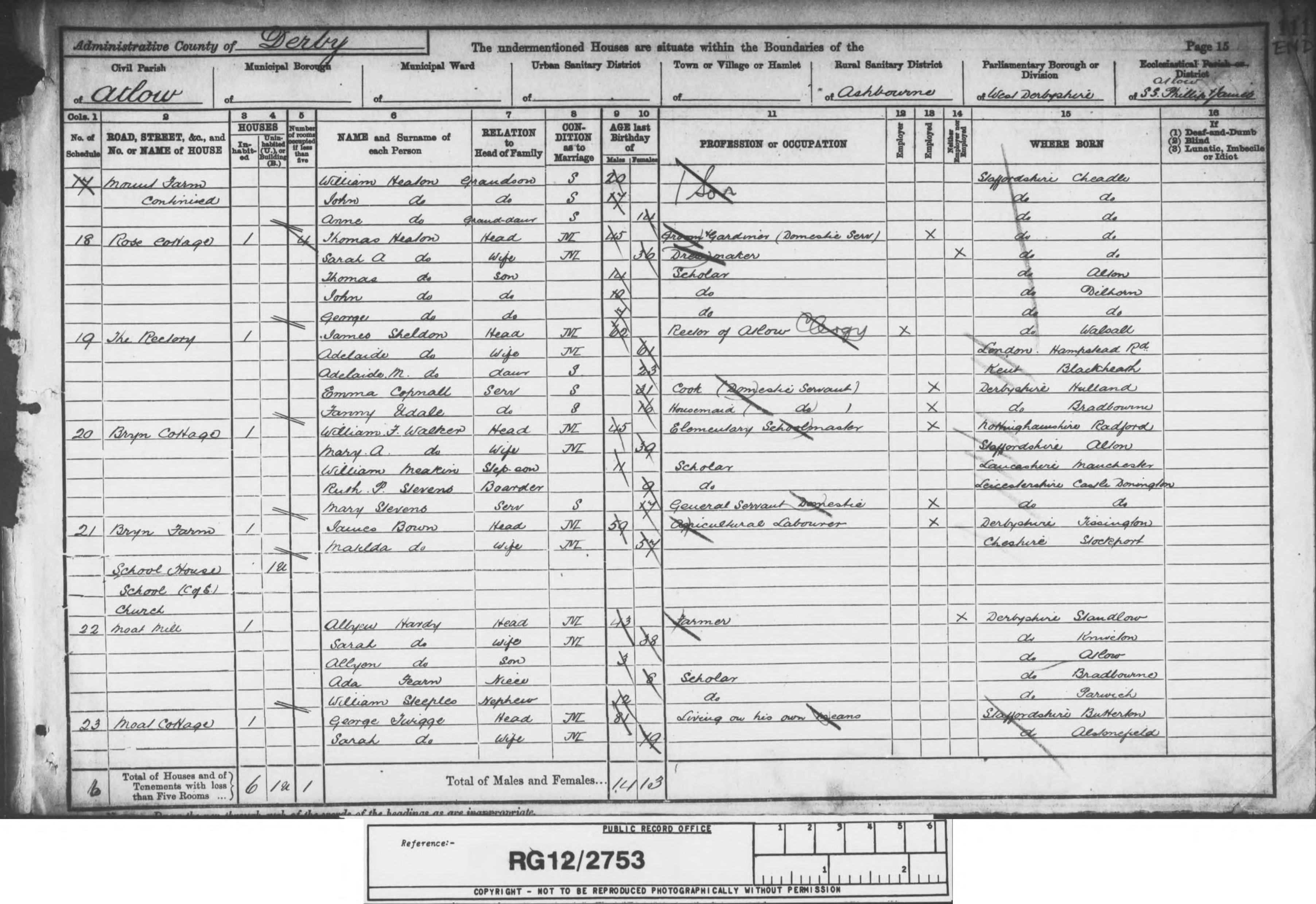 | 24 | 22 | Allyen | Hardy | Head | 1848 | Standlow | 43 | Male | Married | | | | Farmer | | | | | | 25 | 22 | Sarah | Hardy | Wife | 1853 | Kniveton | 38 | Female | Married | | | | | | | | | | 26 | 22 | Allyen | Hardy | Son | 1888 | Atlow | 3 | Male | | | | | | | | | | | 27 | 22 | Ada | Fearn | Niece | 1883 | Bradbourne | 8 | Female | | | | | Scholar | | | | | | 28 | 22 | William | Steeples | Nephew | 1879 | Parwich | 12 | Male | | | | | Scholar | | | | |