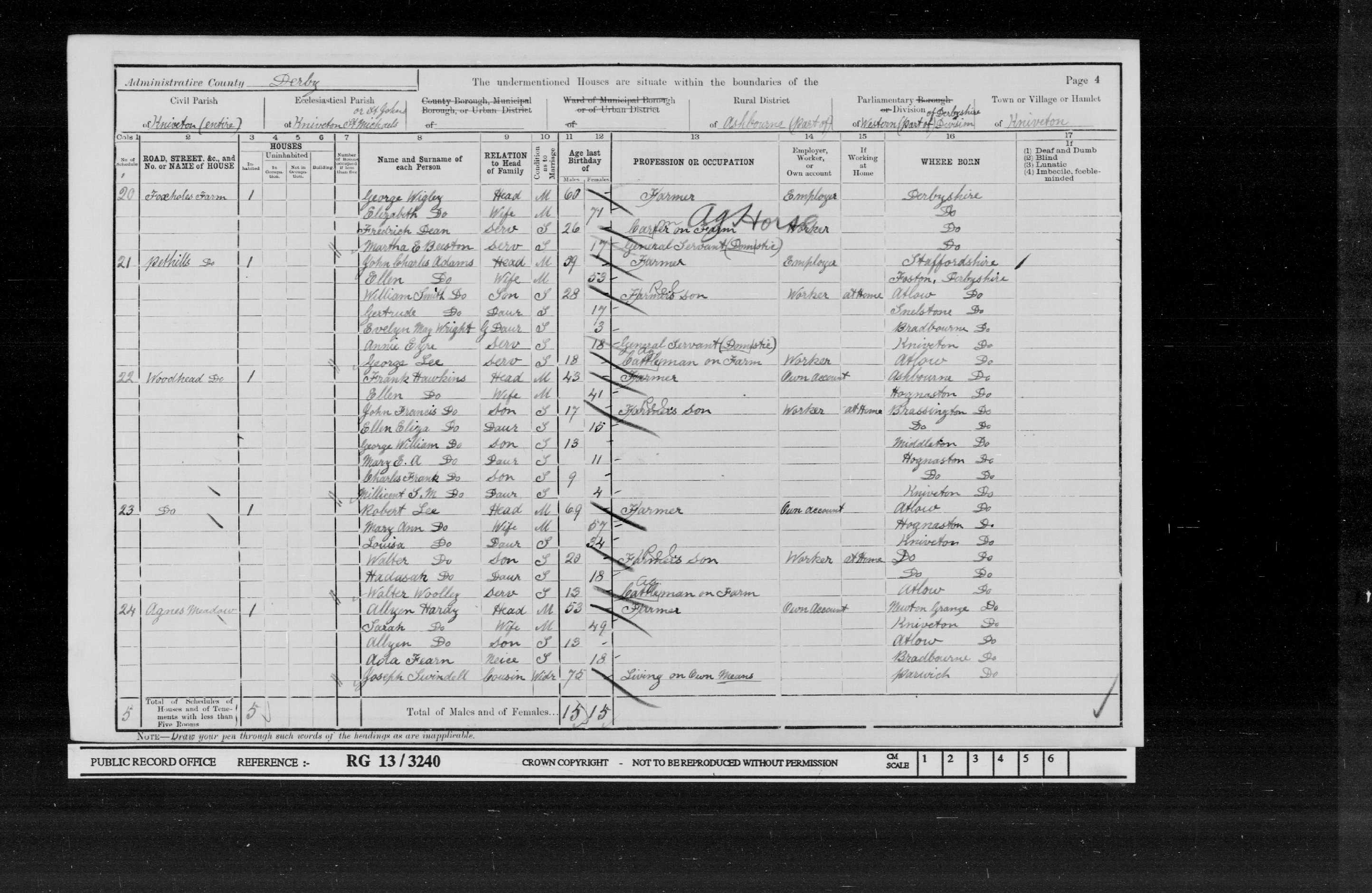 | 26 | 24 | Allyen | Hardy | Head | 1848 | Newton Grange | 53 | Male | Married | | | | Farmer | | | | | | 27 | 24 | Sarah | Hardy | Wife | 1852 | Kniveton | 49 | Female | Married | | | | | | | | | | 28 | 24 | Allyen | Hardy | Son | 1888 | Atlow | 13 | Male | Single | | | | | | | | | | 29 | 24 | Ada | Fearn | Niece | 1883 | Bradbourne | 18 | Female | Single | | | | | | | | | | 30 | 24 | Joseph | Swindell | Cousin | 1826 | Parwich | 75 | Male | Widower | | | | Living on own means | | | | |