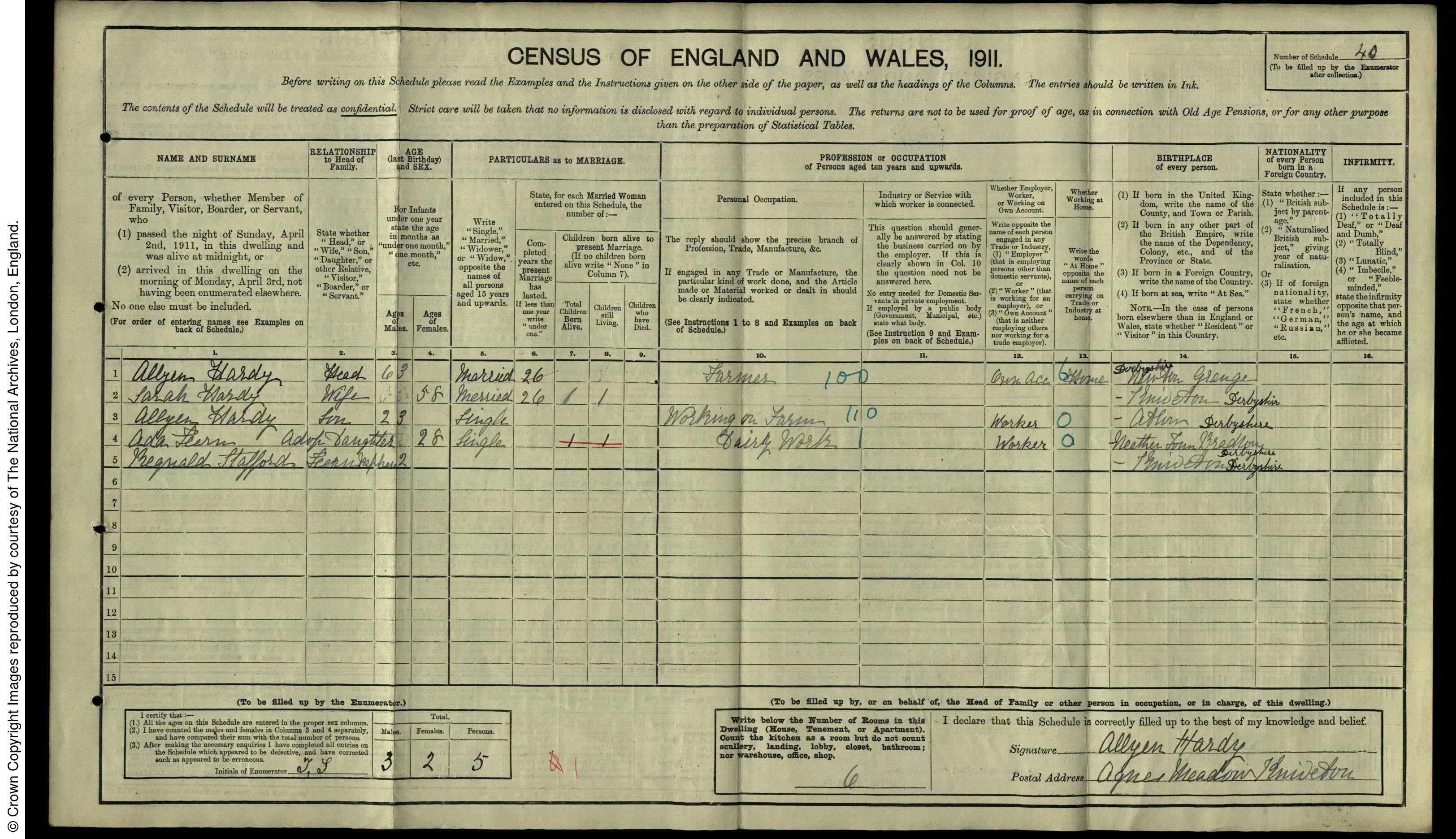 | 1 | 40 | Allyen | Hardy | Head | 1848 | Newton Grange | 63 | Male | Married | | | | Farmer | | | | | | 2 | 40 | Sarah | Hardy | Wife | 1853 | Kniveton | 58 | Female | Married | 26 | 1 | 1 | | | | | | | 3 | 40 | Allyen | Hardy | Son | 1888 | Atlow | 23 | Male | Single | | | | Working on Farm | | | | | | 4 | 40 | Ada | Fearn | Adopted Daughter | 1883 | Nether Town | 28 | Female | Single | | | | Dairy Work | | | | | | 5 | 40 | Reginald Stafford | Fearn | Nephew | 1909 | Kniveton | 2 | Male | | | | | | | | | |