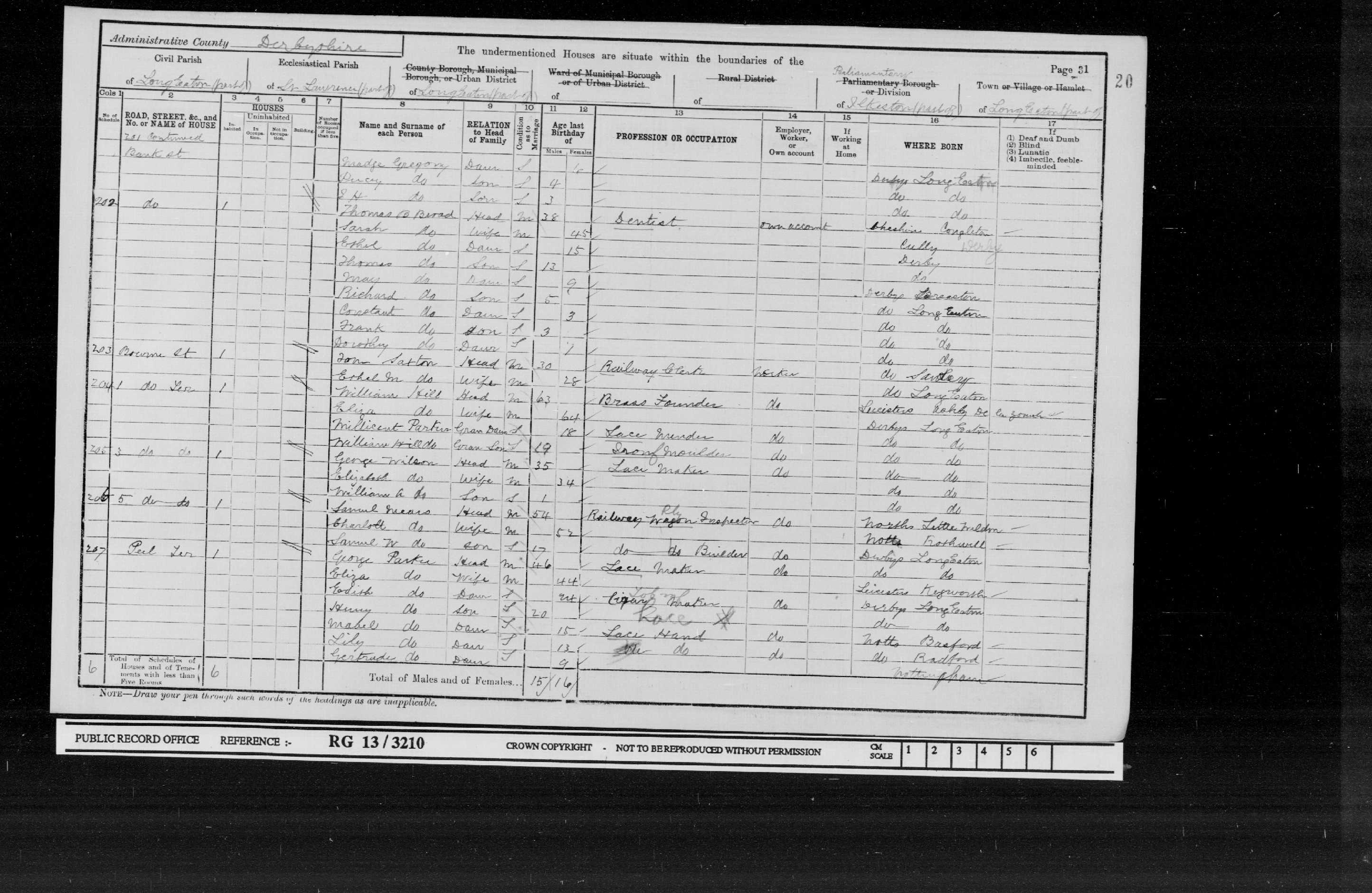 | 4 | 202 | Thomas B | Broad | Head | 1863 | Congleton | 38 | Male | Married | | | | Dentist | | | | | | 5 | 202 | Sarah | Broad | Wife | 1856 | Cubley | 45 | Female | Married | | | | | | | | | | 6 | 202 | Ethel | Broad | Daughter | 1886 | Derby | 15 | Female | Single | | | | | | | | | | 7 | 202 | Thomas | Broad | Son | 1888 | Derby | 13 | Male | Single | | | | | | | | | | 8 | 202 | May | Broad | Daughter | 1892 | Breaston | 9 | Female | Single | | | | | | | | | | 9 | 202 | Richard | Broad | Son | 1896 | Long Eaton | 5 | Male | Single | | | | | | | | | | 10 | 202 | Constant | Broad | Daughter | 1898 | Long Eaton | 3 | Female | Single | | | | | | | | | | 11 | 202 | Frank | Broad | Son | 1898 | Long Eaton | 3 | Male | Single | | | | | | | | | | 12 | 202 | Dorothy | Broad | Daughter | 1900 | Long Eaton | 1 | Female | Single | | | | | | | | |