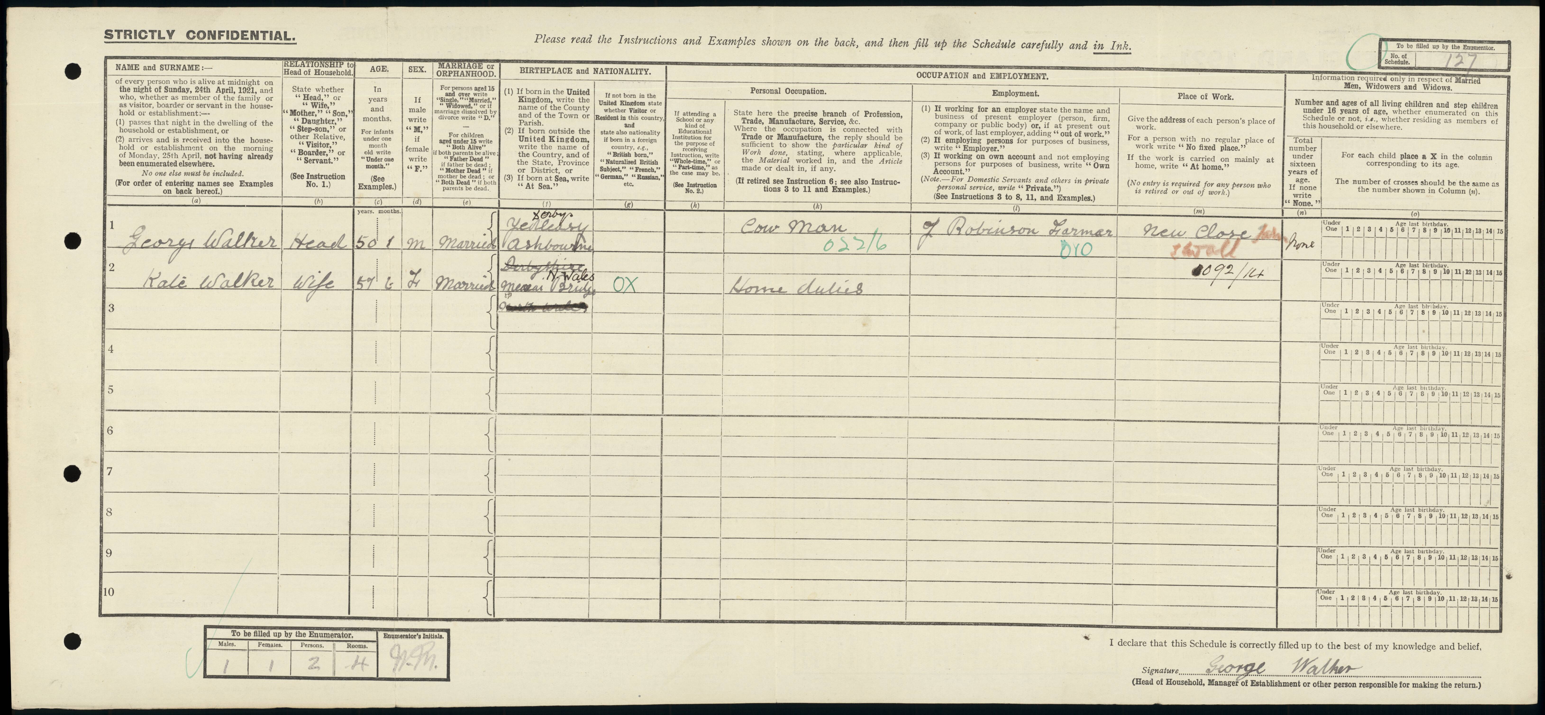 | 1 | 127 | George | Walker | Head | 1871 | Yeldersley | 50 | Male | Married | | | | Cowman | | | | J. Robinson - New Close Farm | | 2 | 127 | Kate | Walker | Wife | 1864 | Menai Bridge | 57 | Female | Married | | | | Home Duties | | | | |