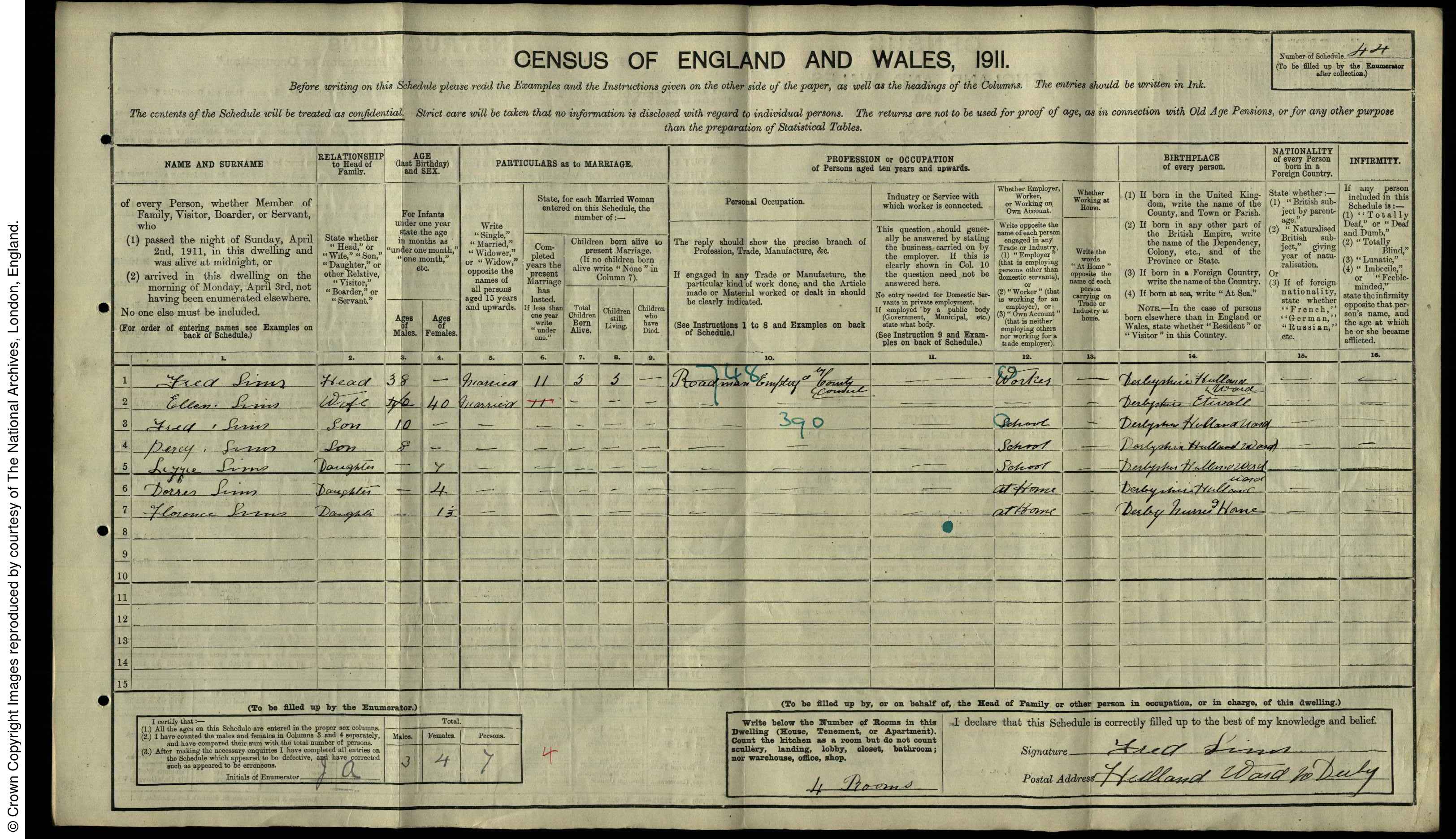 | 1 | 44 | Fred | Sims | Head | 1873 | Hulland Ward | 38 | Male | Married | 11 | 5 | 5 | Roadman | | | | | | 2 | 44 | Ellen | Sims | Wife | 1871 | Etwall | 40 | Female | Married | | | | | | | | | | 3 | 44 | Fred | Sims | Son | 1901 | Hulland Ward | 10 | Male | | | | | School | | | | | | 4 | 44 | Percy | Sims | Son | 1903 | Hulland Ward | 8 | Male | | | | | School | | | | | | 5 | 44 | Lizzie | Sims | Daughter | 1904 | Hulland Ward | 7 | Female | | | | | School | | | | | | 6 | 44 | Dorris | Sims | Daughter | 1907 | Hulland Ward | 4 | Female | | | | | At Home | | | | | | 7 | 44 | Florence | Sims | Daughter | 1910 | Derby Nurses Home | 1 | Female | | | | | At Home | | | | |