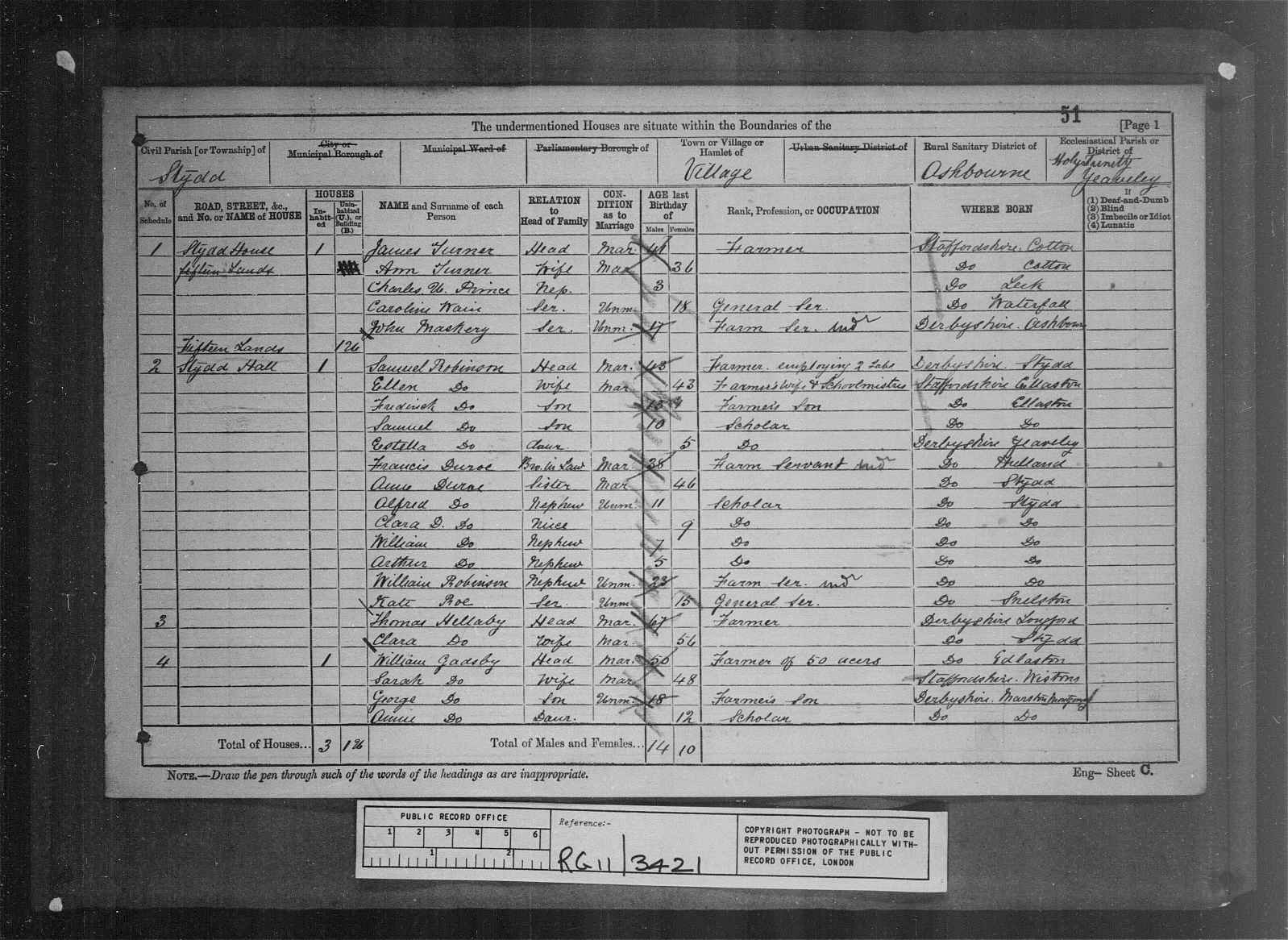 | 5 | 94 | Samuel | Robinson | Head | 1836 | Stydd | 55 | Male | Married | | | | Farmer | | | | | | 6 | 94 | Ellen | Robinson | Wife | 1836 | Ellastone | 55 | Female | Married | | | | | | | | | | 7 | 94 | Fred L | Robinson | Son | 1866 | Ellastone | 25 | Male | Single | | | | Farmer's Son | | | | | | 8 | 94 | Samuel | Robinson | Son | 1871 | Ellastone | 20 | Male | Single | | | | Farmer's Son | | | | | | 9 | 94 | Estelle | Robinson | Daughter | 1876 | Yeaveley | 15 | Female | Single | | | | Farmer's Son | | | | | | 10 | 94 | Alfred | Robinson | Son | 1882 | Stydd | 9 | Male | | | | | Scholar | | | | | | 11 | 94 | John | Titterton | Servant | 1875 | Yeaveley | 16 | Male | Single | | | | Farm Servant | | | | |
