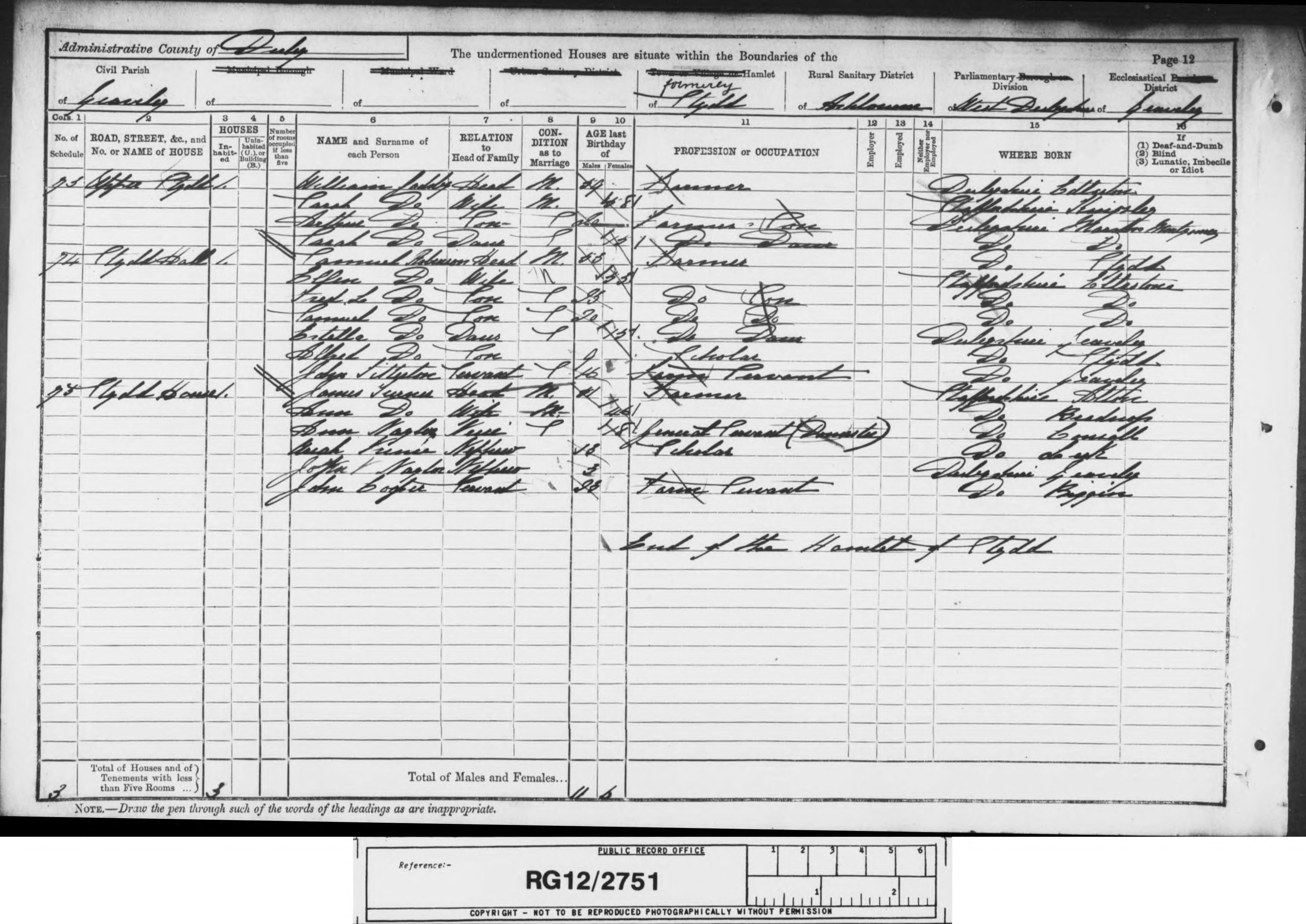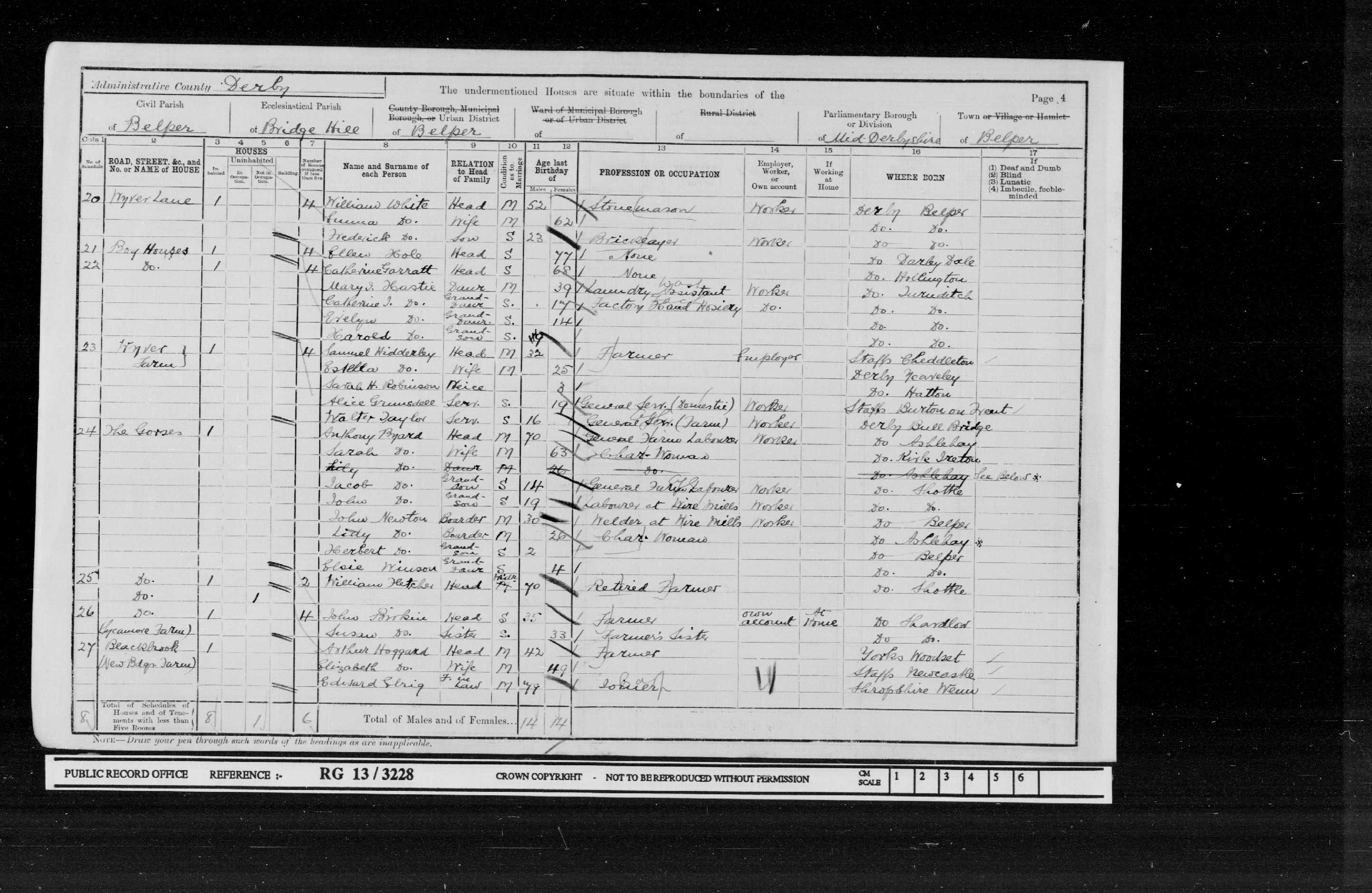 | 1 | 110 | Samuel | Hidderley | Head | 1869 | Cheddleton | 42 | Male | Married | | | | Farmer | | | | | | 2 | 110 | Estella | Hidderley | Wife | 1876 | Stydd | 35 | Female | Married | 13 | 2 | 1 | | | | | | | 3 | 110 | Samuel Richard | Hidderley | Son | 1908 | Belper | 3 | Male | | | | | | | | | | | 4 | 110 | Sarah Ellen | Robinson | Niece | 1898 | Hatton | 13 | Female | | | | | School | | | | | | 5 | 110 | Charles | Billings | Servant | 1884 | Church Broughton | 27 | Male | Single | | | | Waggoner on farm | | | | | | 6 | 110 | Joseph Arthur | Bennett | Servant | 1886 | Belper | 25 | Male | Single | | | | Cowman | | | | | | 7 | 110 | Spencer | Wibberley | Servant | 1897 | Yeaveley | 14 | Male | | | | | Farm Labourer | | | | | | 8 | 110 | Annie Eliza | Brailford | Servant | 1889 | Belper | 22 | Female | Single | | | | General Servant Domestic | | | | |