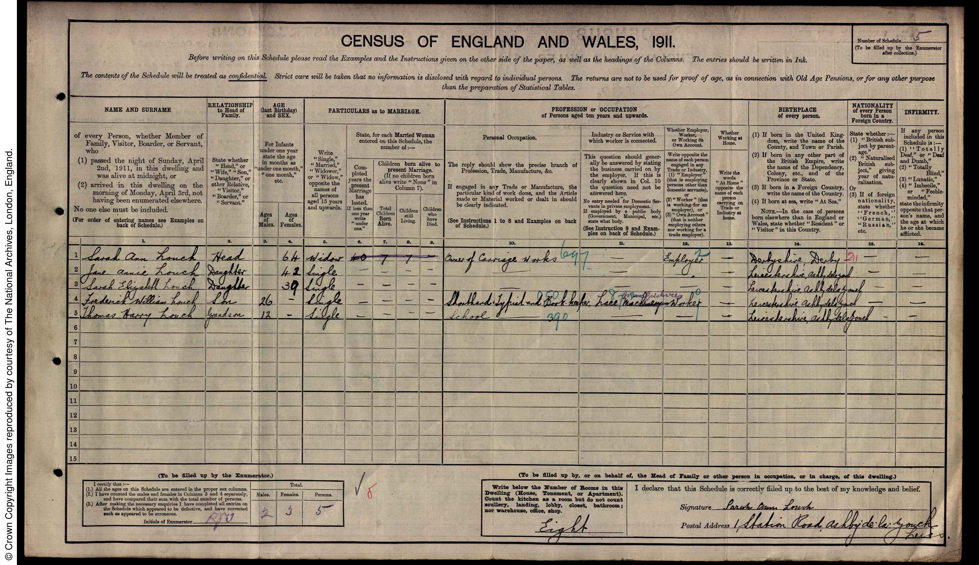 | 1 | 5 | Sarah Ann | Louch | Head | 1847 | Derby | 64 | Female | Widow | 40 | 7 | 7 | Owner Carriage Works | | | | | | 2 | 5 | Jane Annie | Louch | Daughter | 1869 | Ashby-de-la-Zouch | 42 | Female | Single | | | | | | | | | | 3 | 5 | Sarah Elizabeth | Louch | Daughter | 1872 | Ashby-de-la-Zouch | 39 | Female | Single | | | | | | | | | | 4 | 5 | Frederick William | Louch | Son | 1885 | Ashby-de-la-Zouch | 26 | Male | Single | | | | Shorthand Typist and Book Keeper | | | | | | 5 | 5 | Thomas Harry | Louch | Grandson | 1899 | Ashby-de-la-Zouch | 12 | Male | Single | | | | School | | | | |