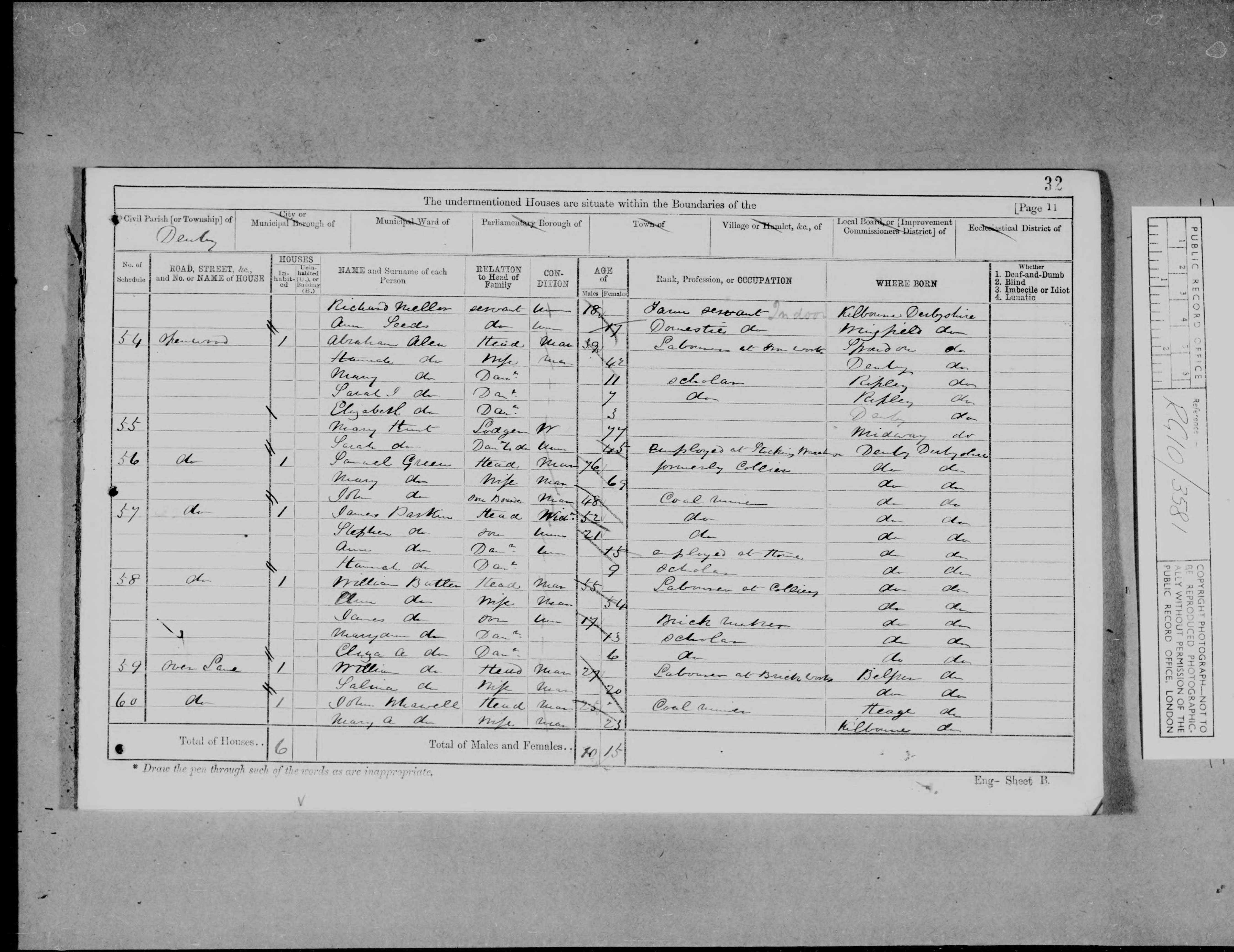 | 8 | 22 | John | Whawell | Head | 1846 | Heage | 55 | Male | Married | | | | Coal Miner Hewer | | | | | | 9 | 22 | Mary A | Whawell | Wife | 1848 | Kilburn | 53 | Female | Married | | | | | | | | | | 10 | 22 | John | Whawell | Son | 1881 | Belper | 20 | Male | Single | | | | Coal Miner Hewer | | | | | | 11 | 22 | Eliza A | Whawell | Daughter | 1887 | Hucknall | 14 | Female | Single | | | | | | | | | | 12 | 22 | David | Farran | Boarder | 1872 | Buckley | 29 | Male | Single | | | | Coal Miner Hewer | | | | | | 13 | 22 | George | Price | Boarder | 1875 | Buckley | 26 | Male | Single | | | | Coal Miner Hewer | | | | |