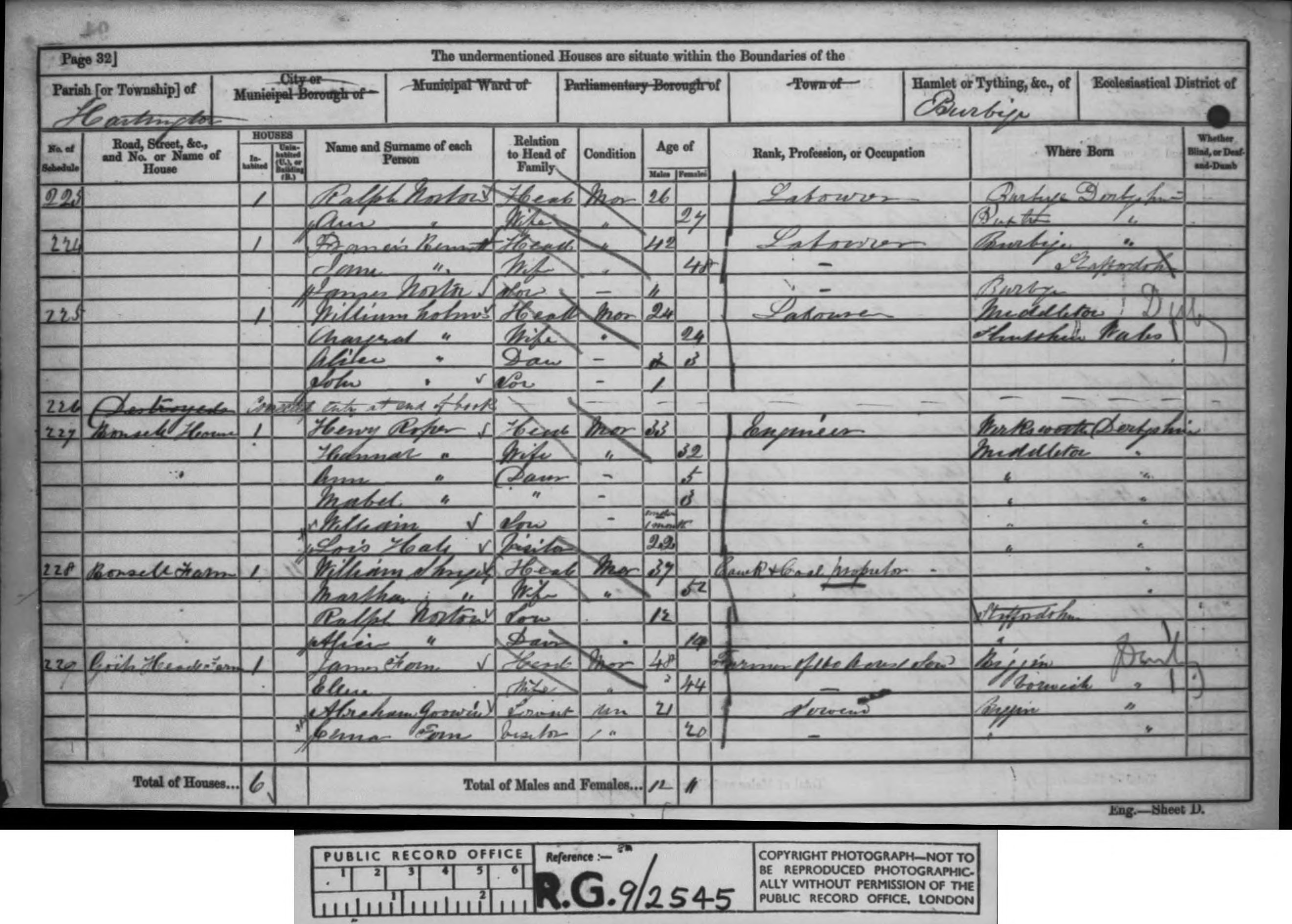 | 17 | 162 | Henry | Roper | Head | 1827 | Middleton | 44 | Male | Married | | | | Engine Tenter on Railway | | | | | | 18 | 162 | Ann | Roper | Daughter | 1856 | Middleton | 15 | Female | Single | | | | Employed at Home | | | | | | 19 | 162 | William | Roper | Son | 1859 | Middleton | 12 | Male | | | | | Scholar | | | | | | 20 | 162 | Esther | Roper | Daughter | 1862 | Hartington | 9 | Female | | | | | Scholar | | | | |