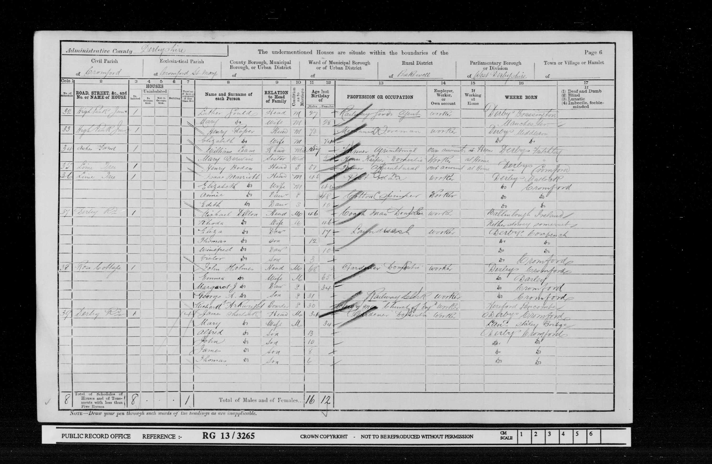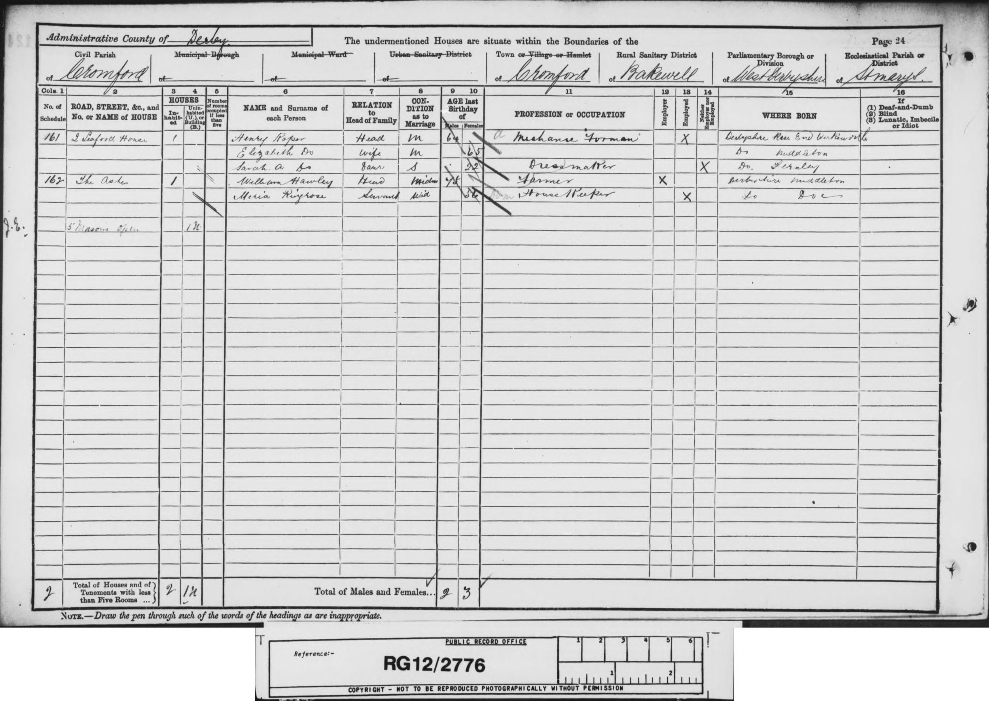 | 1 | 161 | Henry | Roper | Head | 1827 | Wirksworth | 64 | Male | Married | | | | Mechanical Foreman | | | | | | 2 | 161 | Elizabeth | Roper | Wife | 1826 | MIddleton | 65 | Female | Married | | | | | | | | | | 3 | 161 | Sarah A | Roper | Daughter | 1869 | Fernilee | 22 | Female | Single | | | | Dressmaker | | | | |
