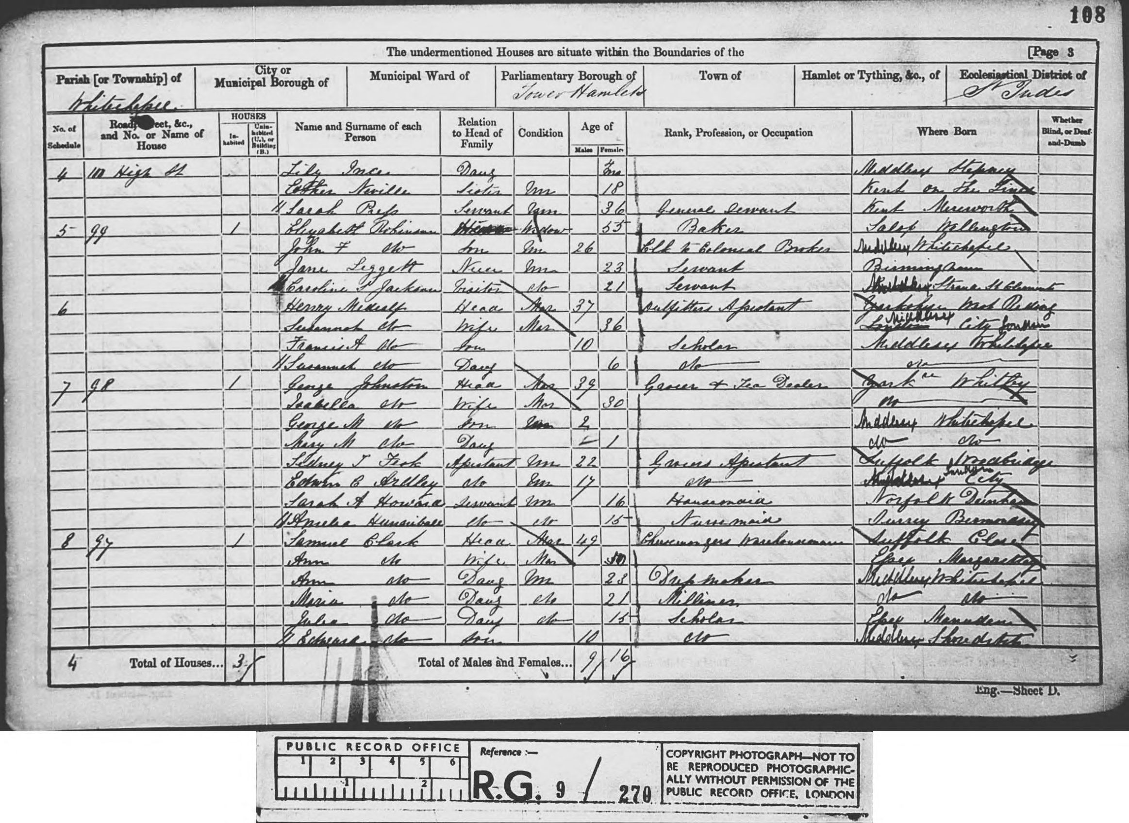| 8 | 6 | Henry | Metcalf | Head | 1824 | Yorkshire | 37 | Male | Married | | | | Outfitters Assistant | | | | | | 9 | 6 | Susannah | Metcalf | Wife | 1825 | Middlesex | 36 | Female | Married | | | | | | | | | | 10 | 6 | Francis A | Metcalf | Son | 1851 | Whitechapel | 10 | Male | | | | | Scholar | | | | | | 11 | 6 | Susannah | Metcalf | Daughter | 1855 | Whitechapel | 6 | Female | | | | | Scholar | | | | |