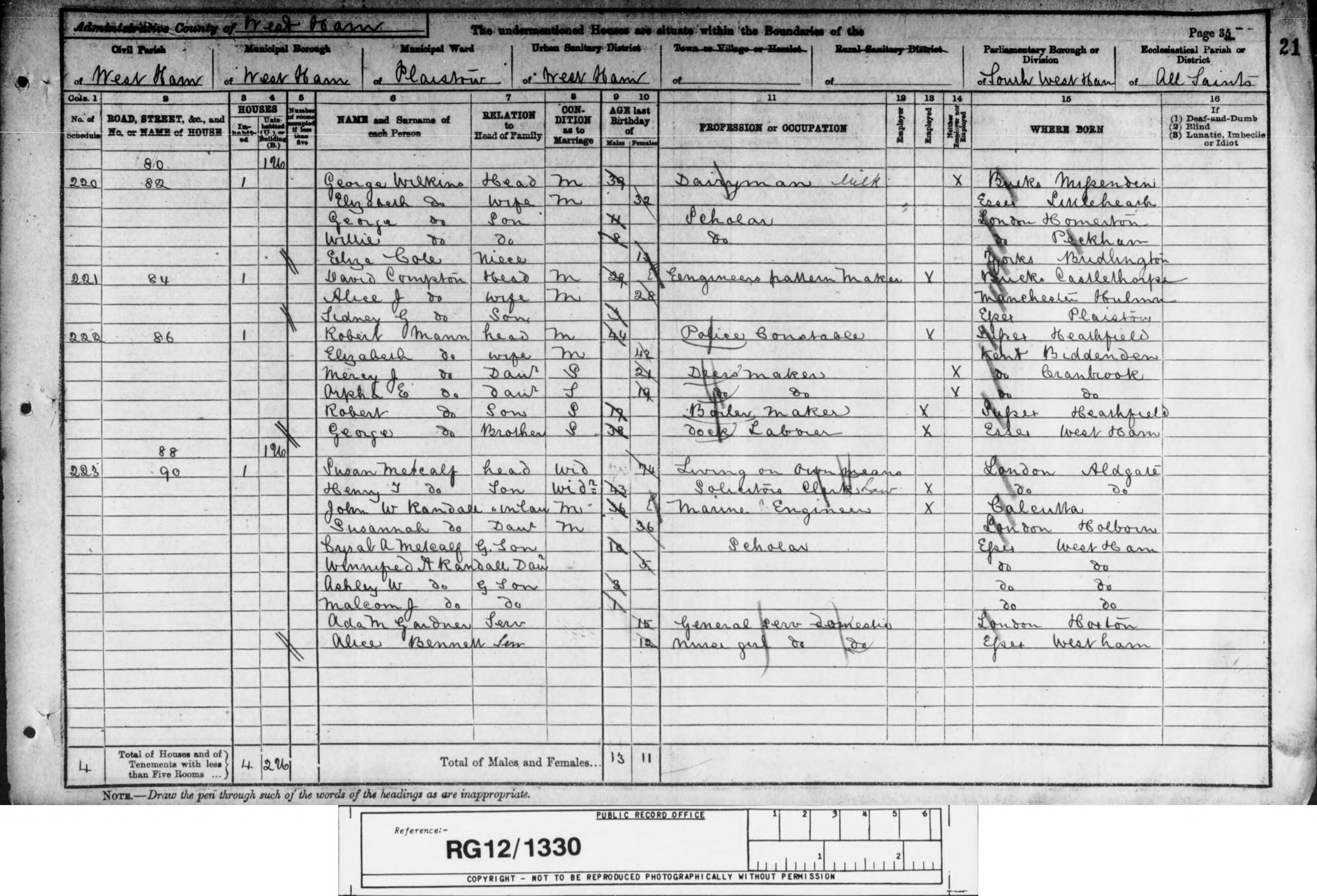 | 17 | 203 | Susan | Metcalf | Head | 1817 | London | 74 | Female | Widow | | | | Living on own means | | | | | | 18 | 203 | Henry T | Metcalf | Son | 1848 | London | 43 | Male | Widower | | | | Solicitor's Clerk | | | | | | 19 | 203 | John W | Randall | Son-in-Law | 1855 | Caleulla | 36 | Male | Married | | | | Marine Engineer | | | | | | 20 | 203 | Susannah | Randall | Daughter | 1855 | London | 36 | Female | Married | | | | | | | | | | 21 | 203 | Cyril A | Metcalf | Grandson | 1881 | West Ham | 10 | Male | | | | | Scholar | | | | | | 22 | 203 | Winfred A | Randall | Daughter | 1886 | West Ham | 5 | Female | | | | | | | | | | | 23 | 203 | Ashley W | Randall | Grandson | 1888 | West Ham | 3 | Male | | | | | | | | | | | 24 | 203 | Malcolm J | Randall | Grandson | 1890 | West Ham | 1 | Male | | | | | | | | | | | 25 | 203 | Ada M | Gardner | Servant | 1876 | Hoxton | 15 | Female | | | | | General Servant | | | | | | 26 | 203 | Alice | Bennett | Servant | 1879 | West Ham | 12 | Female | | | | | Nurse Girl Servant | | | | |