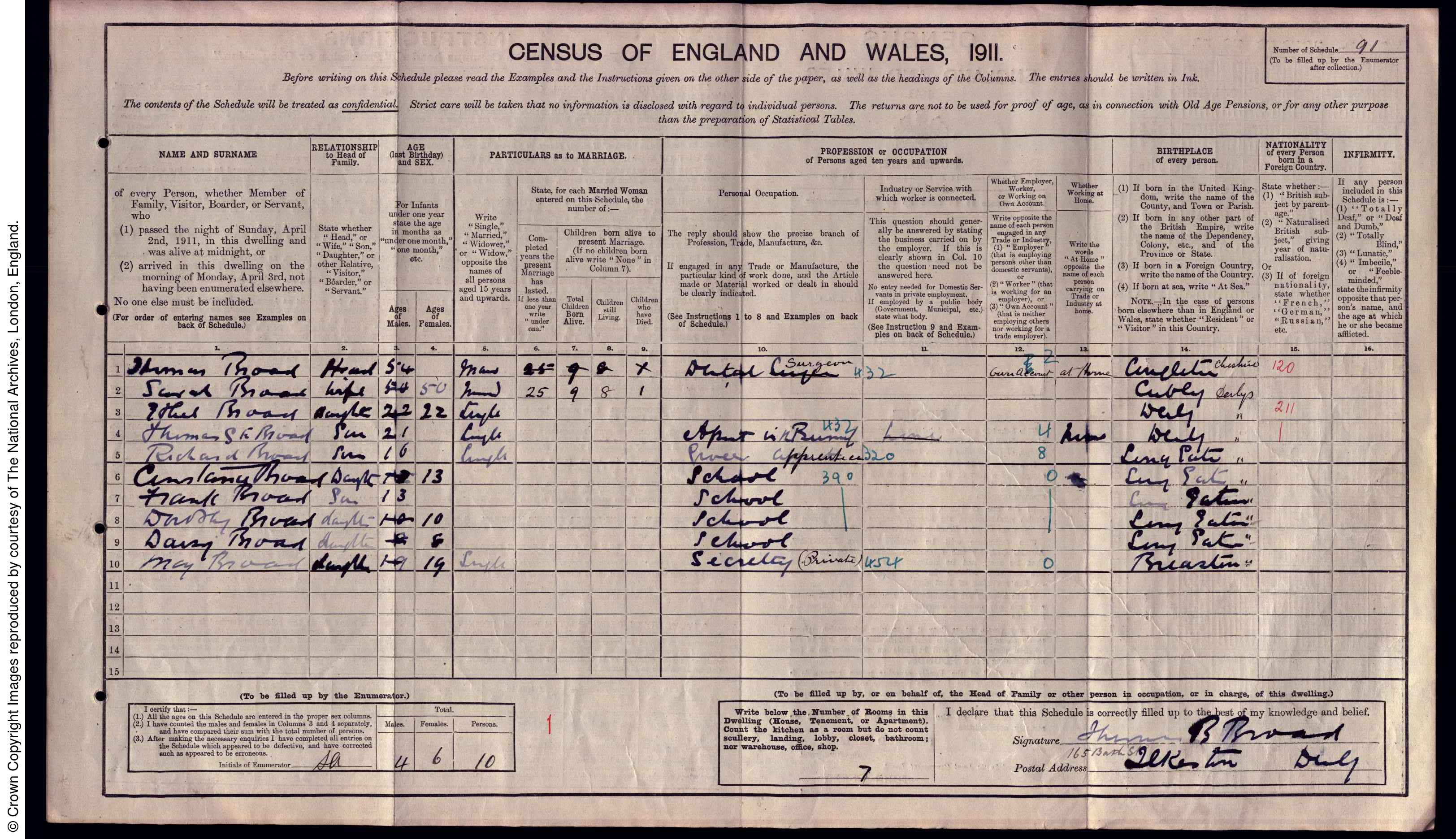 | 1 | 91 | Thomas | Broad | Head | 1857 | Congleton | 54 | Male | Married | | | | Dental Surgeon | | | | | | 2 | 91 | Sarah | Broad | Wife | 1861 | Cubley | 50 | Female | Married | 25 | 9 | 8 | | | | | | | 3 | 91 | Ethel | Broad | Daughter | 1889 | Derby | 22 | Female | Single | | | | | | | | | | 4 | 91 | Thomas | Broad | Son | 1890 | Derby | 21 | Male | Single | | | | Assist in Business | | | | | | 5 | 91 | Richard | Broad | Son | 1895 | Long Eaton | 16 | Male | Single | | | | Grocer's Apprentice | | | | | | 6 | 91 | Constance | Broad | Daughter | 1898 | Long Eaton | 13 | Female | | | | | School | | | | | | 7 | 91 | Frank | Broad | Son | 1898 | Long Eaton | 13 | Male | | | | | School | | | | | | 8 | 91 | Dorothy | Broad | Daughter | 1901 | Long Eaton | 10 | Female | | | | | School | | | | | | 9 | 91 | Daisy | Broad | Daughter | 1903 | Long Eaton | 8 | Female | | | | | School | | | | | | 10 | 91 | May | Broad | Daughter | 1892 | Breaston | 19 | Female | Single | | | | Private Secretary | | | | |
