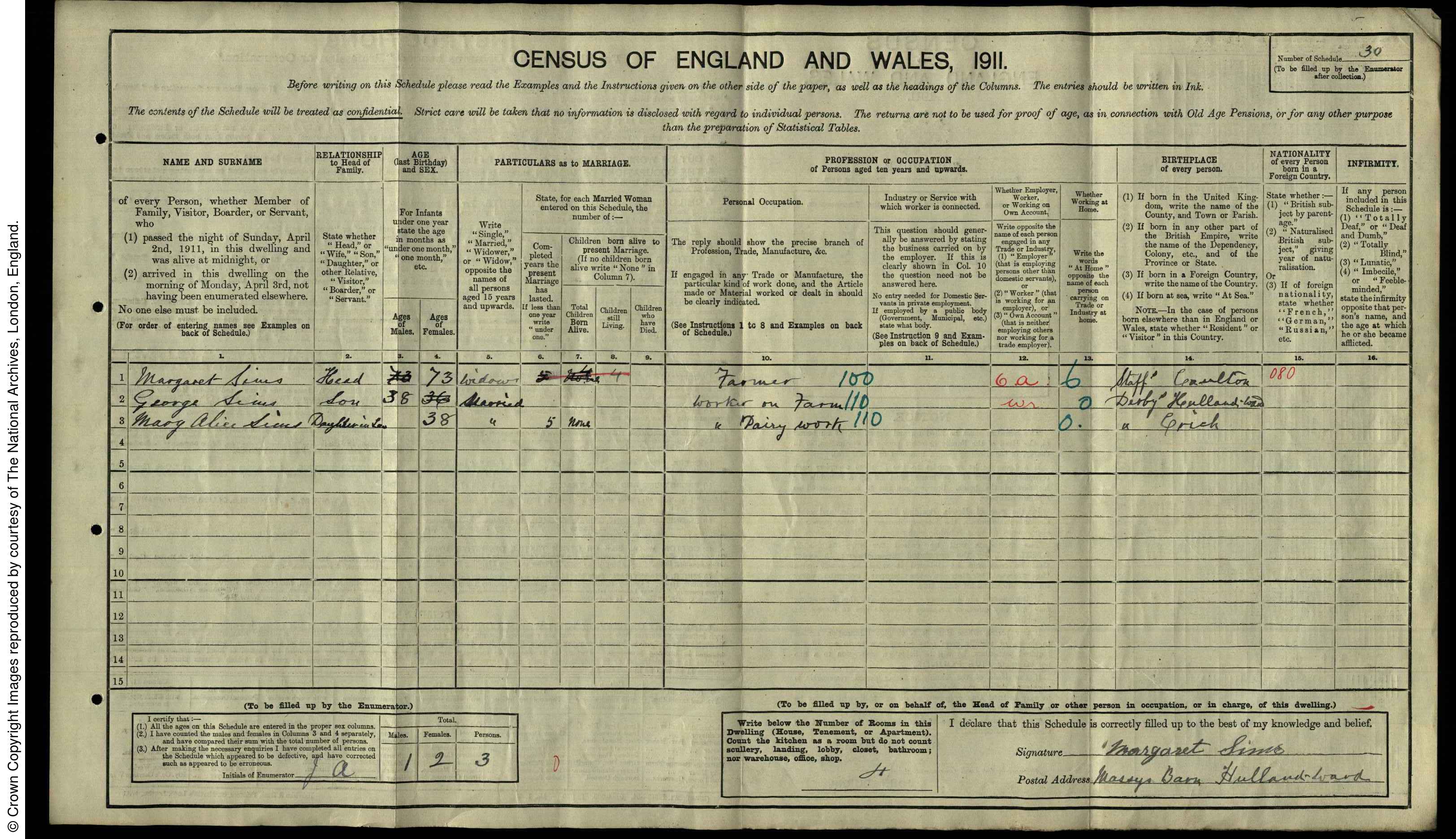 | 1 | 30 | Margaret | Sims | Head | 1838 | Calton | 73 | Female | Widow | | | | Farmer | | | | | | 2 | 30 | George | Sims | Son | 1873 | Hulland Ward | 38 | Male | Married | | | | Worker on Farm | | | | | | 3 | 30 | Mary Alice | Sims | Daughter-in-Law | 1873 | Crich | 38 | Female | Married | 5 | 0 | 0 | Worker Dairy Work | | | | |