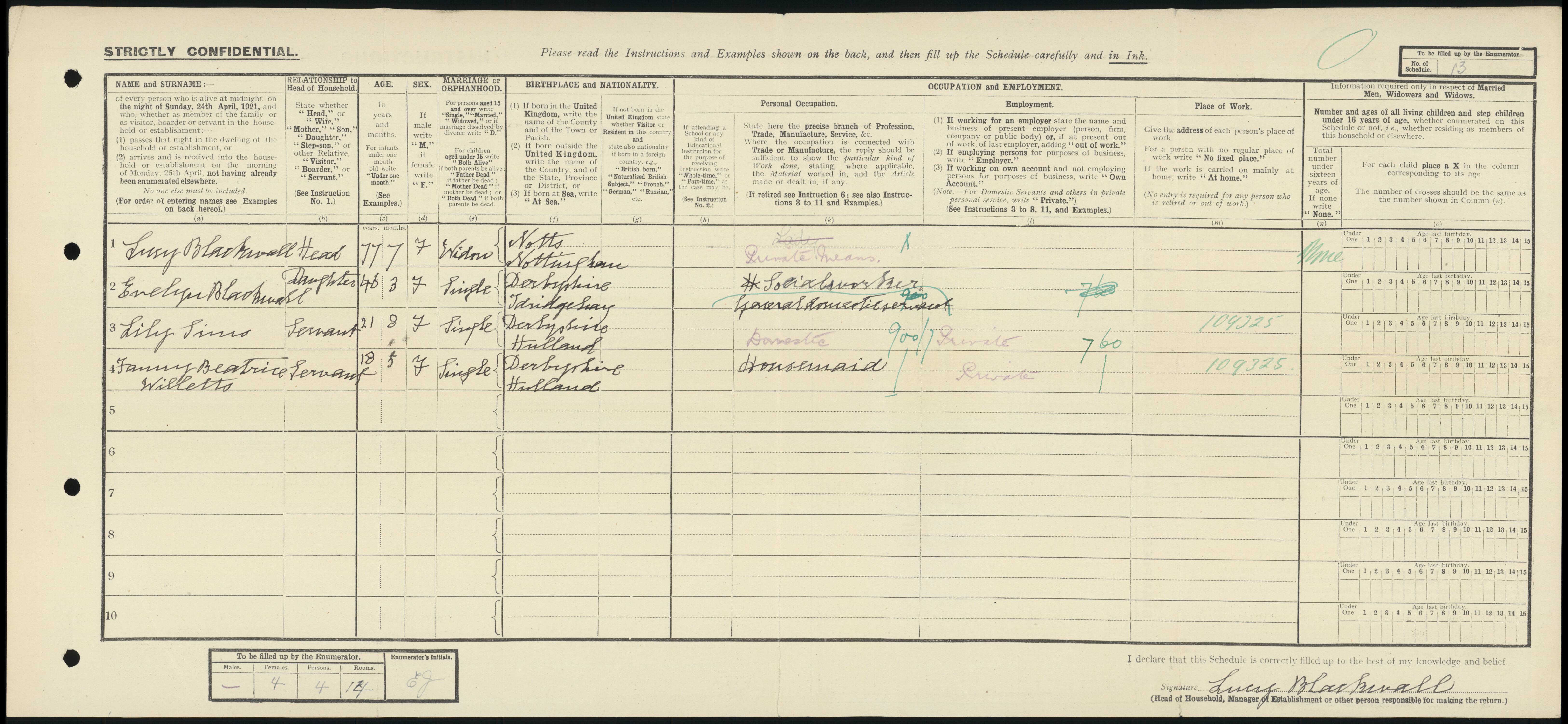| 1 | 13 | Lucy | Blackwell | Head | 1844 | Nottingham | 77 | Female | Widow | | | | Private Means | | | | | | 2 | 13 | Evelyn | Blackwell | Daughter | 1875 | Idridgehay | 46 | Female | Single | | | | Social Worker | | | | | | 3 | 13 | Lily | Sims | Servant | 1900 | Hulland | 21 | Female | Single | | | | Domestic Servant | | | | | | 4 | 13 | Fanny Beatrice | Willetts | Servant | 1903 | Hulland | 18 | Female | Single | | | | Housemaid | | | | |